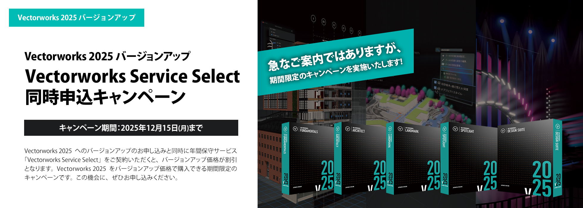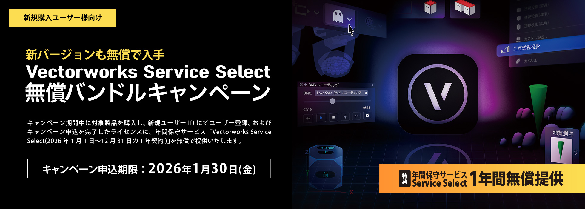 10月17日(金)から対象製品のご購入、新規ユーザIDにてユーザ登録、およびキャンペーン申込を完了いただいたライセンスに、年間保守サービスVectorworks Service Selectを無償提供するキャンペーンを実施します -
