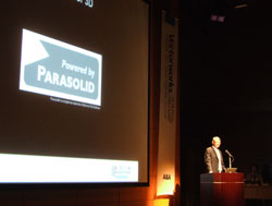 さらに、2D曲線に対し2Dオフセットを行った際の精度の高さを実演し、2Dにも大きな恩恵を与えるParasolidの性能をアピール。続けて、多数ある新機能の中から、スナップルーペをはじめ、大幅に見直されたスナップ機能、リソースブラウザ、建築設計支援機能、3D PowerPack、テクスチャマッピング、互換性、データライブラリなど、大幅に強化された各機能を紹介し、会場では配布された資料に熱心にメモを取る姿も多く見られ、2009への大きな期待が感じられるデモンストレーションとなりました。 |