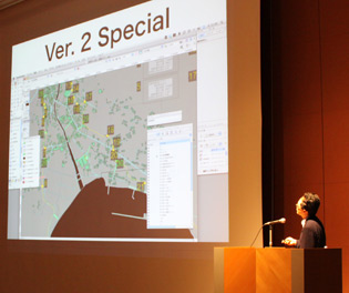 さまざまな事例をお見せしましたが、「SimTread」を使ってもっと何かできないかと考え、昨年4月頃に岩手県のある町を取り上げて津波のシミュレーションを試みました。高台に至る道が海抜20mを超えたところで、避難完了ということにして、約1万2千人をプロットして計算してみました。そして各避難者の避難時間を色分けでプロットしてみたところ、避難困難地域がはっきりと見えてきました。これも可視化の効用です。これを基にして津波避難ビルや新しい避難経路をつくる等、対策を行うことで合理的な避難計画ができると思います。実際に現地には訪れていませんが、対策を考えるには非常にはわかりやすいのではないかと感じます。