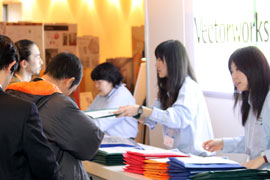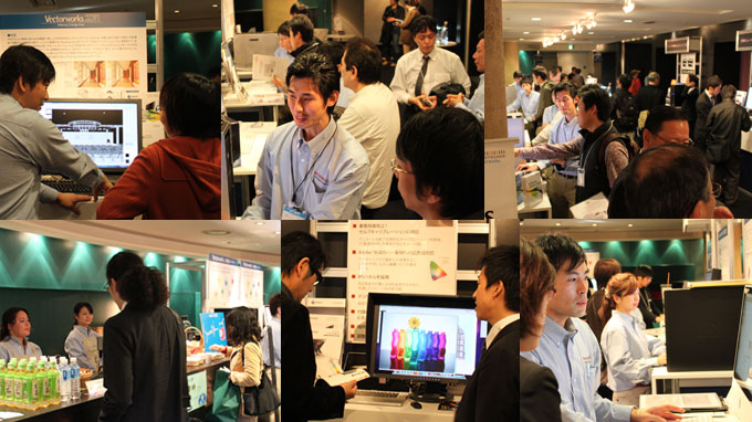 展示ゾーンでは、Vectorworks2011をはじめ、Vectorworks関連製品をご紹介するA&Aコーナー、高速なワークステーション、目にも優しいモニター、大判のプリンターなど実機を体感できるコーナーなど、Vectorworksソリューション機器が勢揃いしました。発表間近の「Vectorworks2011シリーズ」が展示されたコーナーは新機能についてより詳しい説明を求める来場者の方々が列をつくり、スタッフの声とお客様で熱気に溢れました。 |