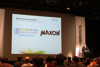 そして、Vectorworks2011の革新的な進化として、Maxonとのパートナーシップを結び、RenderworksにCINEMA4Dのレンダリングエンジンを搭載したことを発表。「CINEMA4Dの強力な64ビットレンダリングエンジン搭載により、新バージョンのRenderworksは以前から最も熱望されていたレンダリング速度が世界最速に、出力品質も劇的に向上し、よりリアルな影やテクスチャなど大規模なシーンのレンダリングもメモリ不足になることはありません。