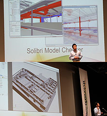 また、Vectorworksを中心とする連携の一つとして、Vectorworksと構造設計CAD:Scia、設備設計CAD:DDS(Data Design System)を使用し、AIA(アメリカ建築家協会)のIPD(Integrated ProjectDelivery)方式に準拠したケーススタディを紹介、「日本にはまだないワークフローとはいえ大変興味深い作業方法でありプロジェクト中に生成されたIFCのファイルなどすべてがホームページ(http://www.nemetschek.net/bim)から閲覧ダウンロードできます。」と、Vectorworksを利用したopenBIMへの活動とその重要性を解説しました。