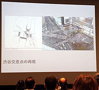 初めに「アーキテクチャはコンピュータ用語、アーキテクチャーは建築用語です。今日はそれらがどう関係するのかお話したいと思います。」と話し、学生時代に関わった仙台メディアテークのコンペ計画案をスクリーンに映しながら「これは好きな場所で本を借りて好きな場所で返すという提案です。空間として担保すべき検索性能をコンピュータに任せ、建築は意図しなかった場所に出会うようなことになれば良いのではと思いました。それが"コンピュータ"と"建築"の棲み分けではないか、という話を当時していました。」と学生時代からこの2つの関係について考えていたことを説明しました。