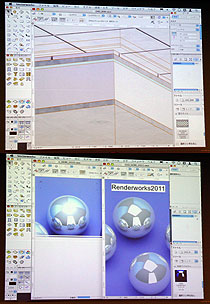 そして2011の大きな目玉の一つRenderworksについて、「従来ライトワークス社のエンジンを搭載していたRenderworksが、64ビットのCINEMA 4Dエンジンを手にしました。」と紹介、その結果、飛躍的にスピードアップしたレンダリングのデモンストレーションが行われ、さらにソフトシャドウの光源で手元はくっきり遠くがぼやけ、よりリアルな効果を得られることも解説、品質面からも劇的に進化したことが紹介されました。