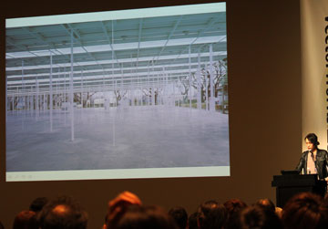 まず、『人工と自然』と題して、2008年のベネチア・ビエンナーレ国際建築展日本館で行った4つの温室について解説、「自然と人工を等価に扱いたいと思い、また、ジャルディーニ公園の休憩所のような新しい機能も付加したいと思い、つくりました。」と作品に対する想いを語り、「4つの温室は、シャボン玉のようなガラスに包まれることで環境にゆらぎが生まれ、透過する光は違う風景を映し出し、何時間もそこで休憩する人もいて、展示というより休憩所に近かったと思います。」と想いを具現化する手法を披露されました。