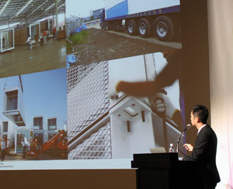 さらに、『市場×建築』では、「市場に何か働きかけることで、建築にデザインされる市場があるのではないか?と考えました。」と、コンテナサイズで建設したベイサイドマリーナホテル横浜の例を挙げ、「コンテナのネットワークを利用し建築が変わるのではないか考えています。低コストとするためにタイで生産したコンテナサイズの完成品をコンテナ船で運び、日本での工事は最小限にしました。稼働性があるので、他の敷地での転用も可能です。」と工事の様子を映像で紹介し、次に画一化された住宅が立ち並ぶカナダの例を映し、「建築家が住宅は何かということに関わろうと思ったら、生産や流通の仕組みに踏み込まざるを得ないと思っています。」と建築を超える領域や知識への踏み込みも必要ではないかと参加者へ訴えました。