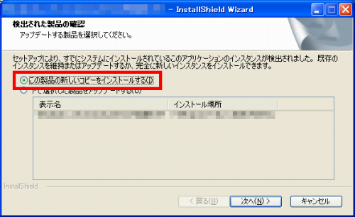 ◎インストール開始時に、「検出された製品の確認:アップデートする製品を選択してください」というメッセージが表示される場合は、「この製品の新しいコピーをインストールする」を選択してください。