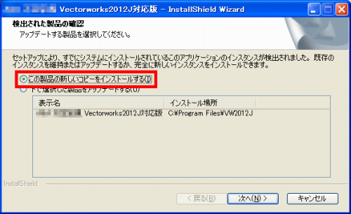 ◎インストール開始時に、「検出された製品の確認:アップデートする製品を選択してください」というメッセージが表示される場合は、「この製品の新しいコピーをインストールする」を選択してください。