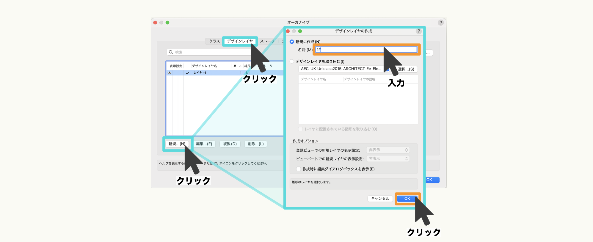 『ツール』メニュー >『オーガナイザ』を開き、「デザインレイヤ」タブを選択して「新規」ボタンをクリックします。名前に「1F」と入力して「OK」ボタンをクリックします。