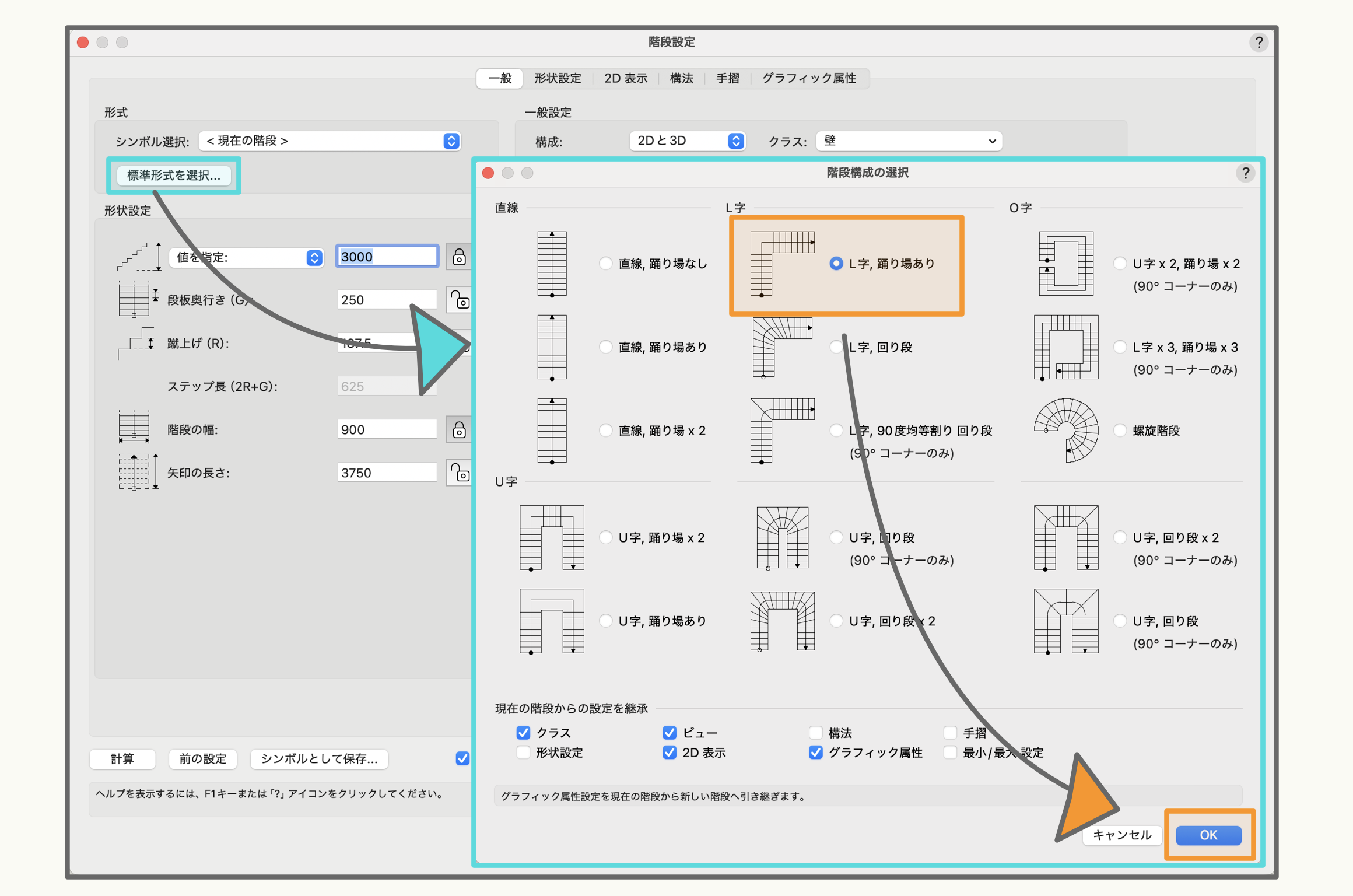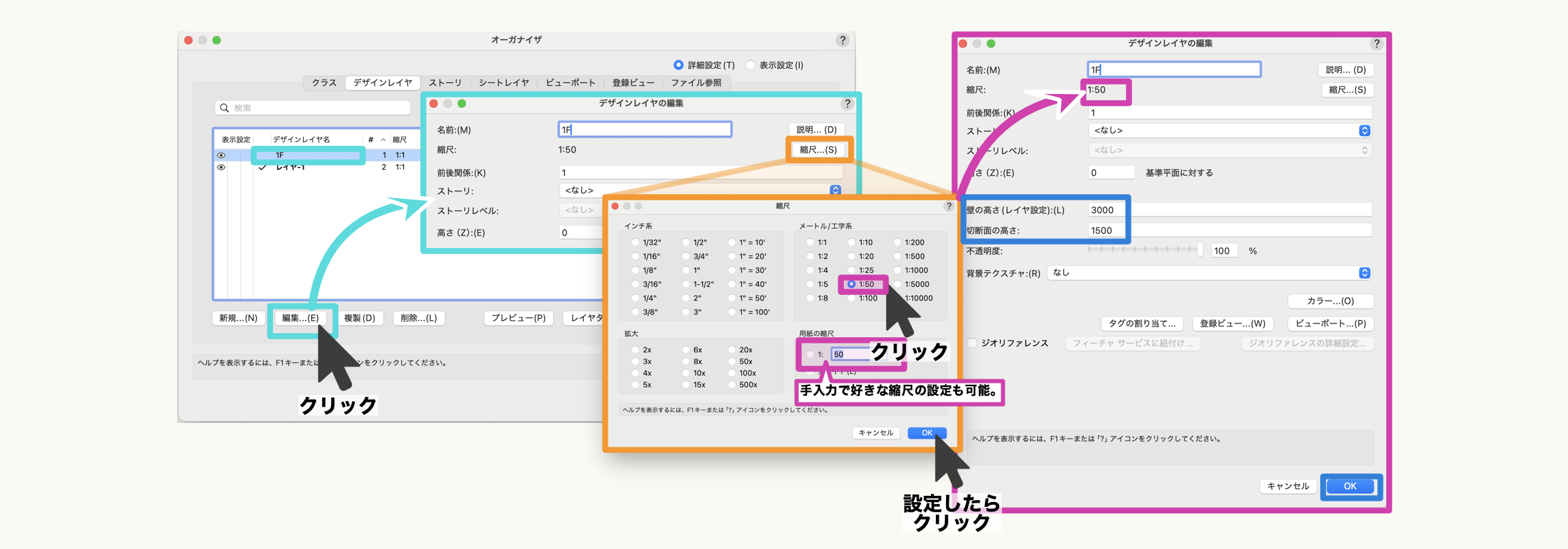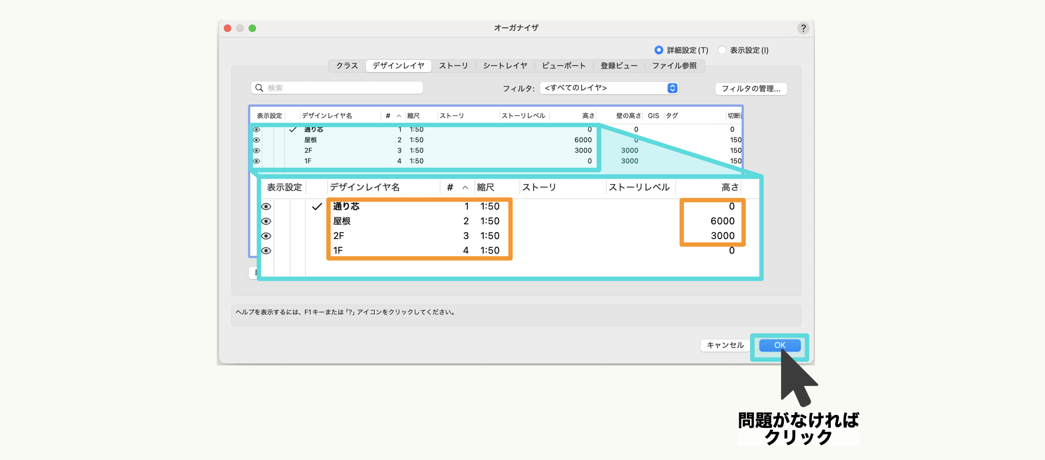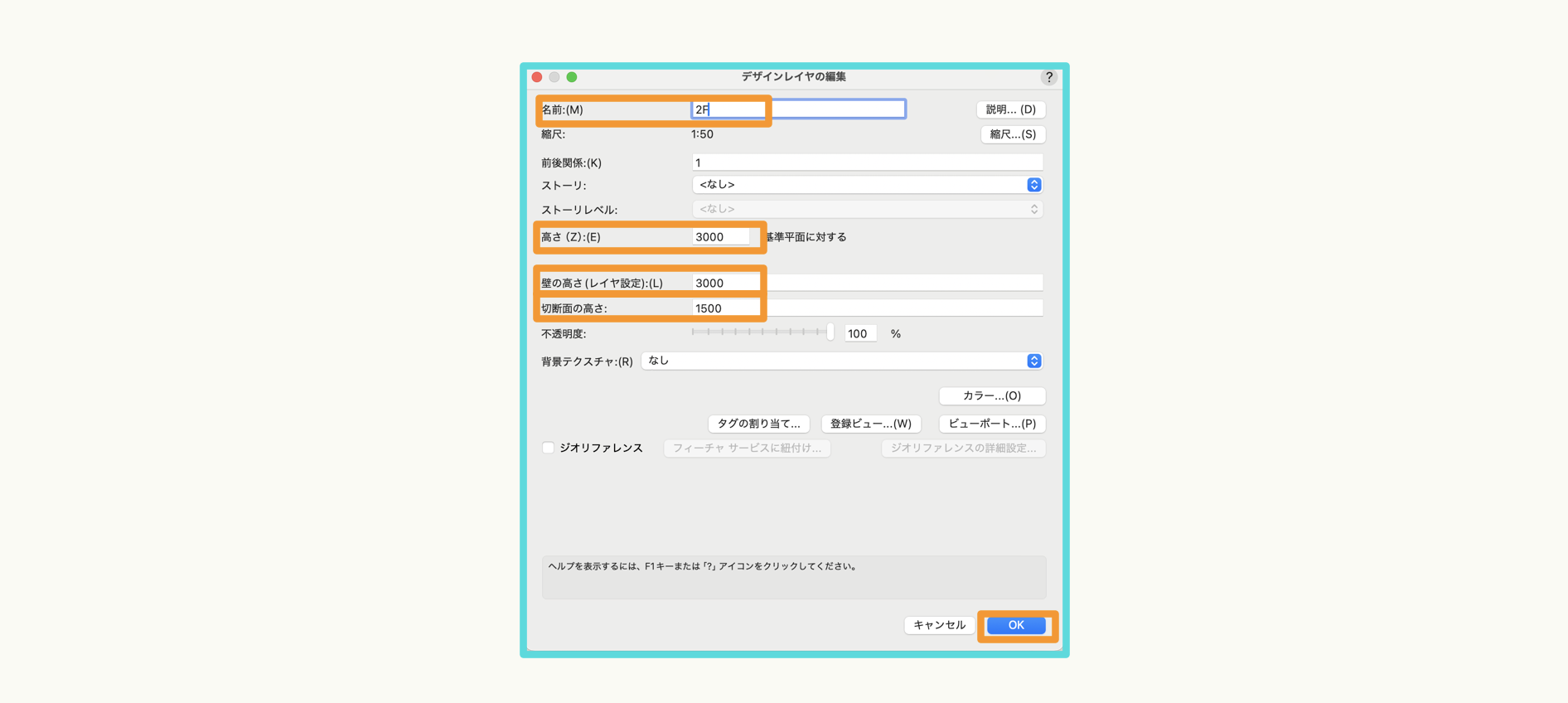 2Fレイヤは自動で設定されている「縮尺 1:50」「高さ:3000」「壁の高さ:3000」「切断面の高さ:1500」になっていることを確認し、2Fレイヤの作成は完了です。
