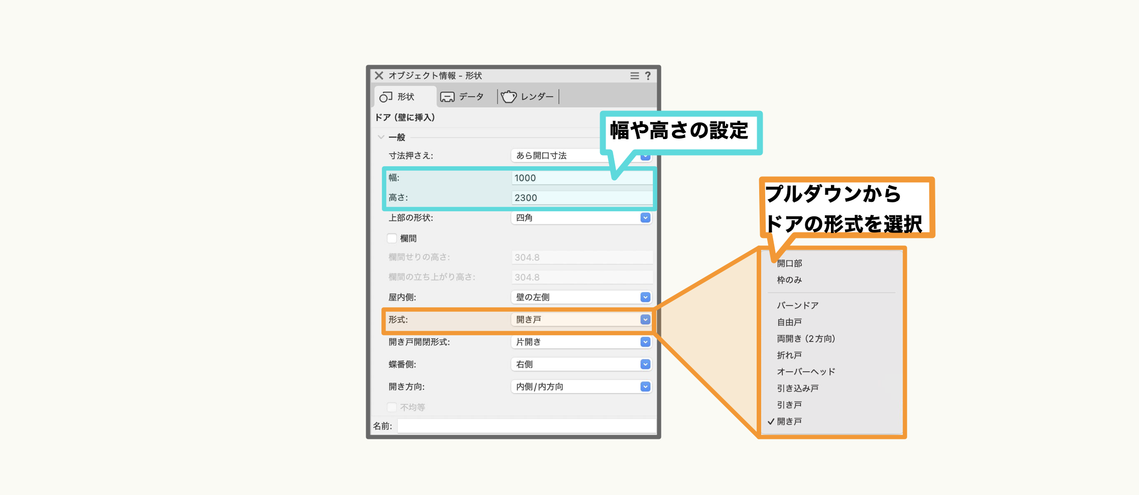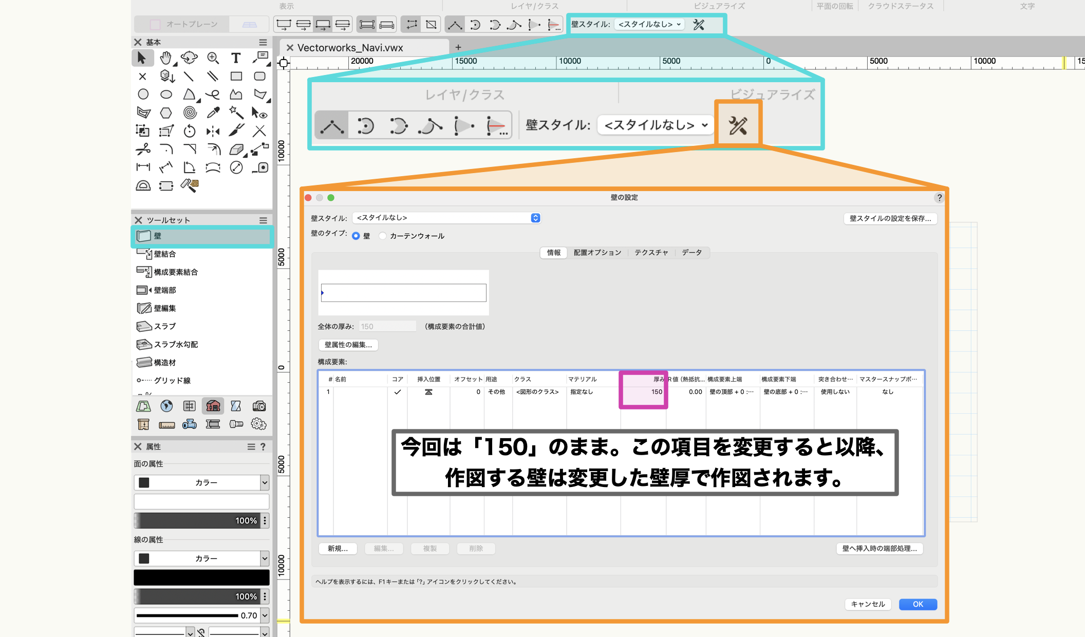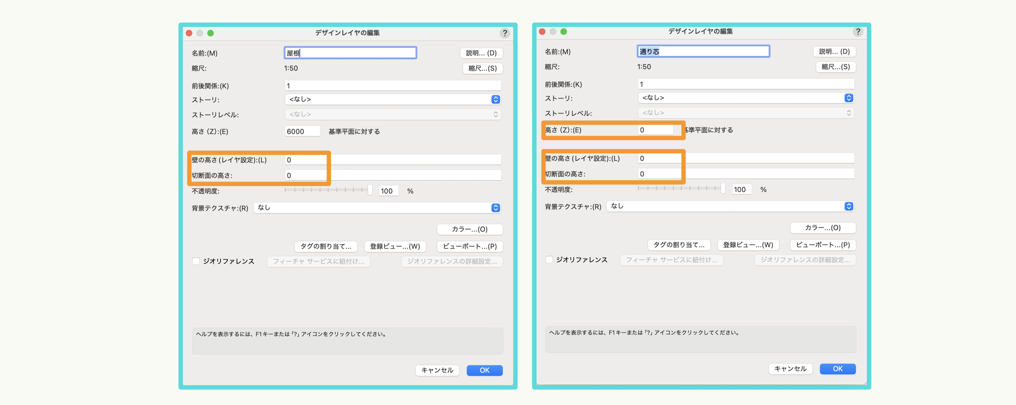また、「高さ」「壁の高さ」「切断面の高さ」にも数値が入っています。これもVectorworksが自動的に先に作成したレイヤの情報を参照して、1Fレイヤの壁の高さの上に来るようにレイヤの高さを設定してくれるためです。