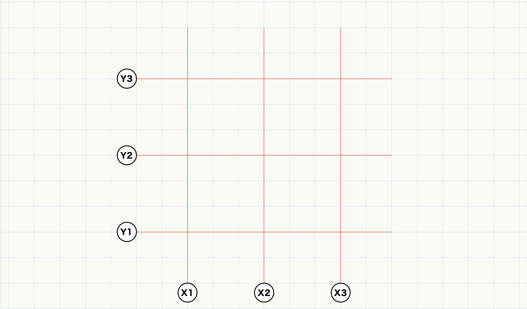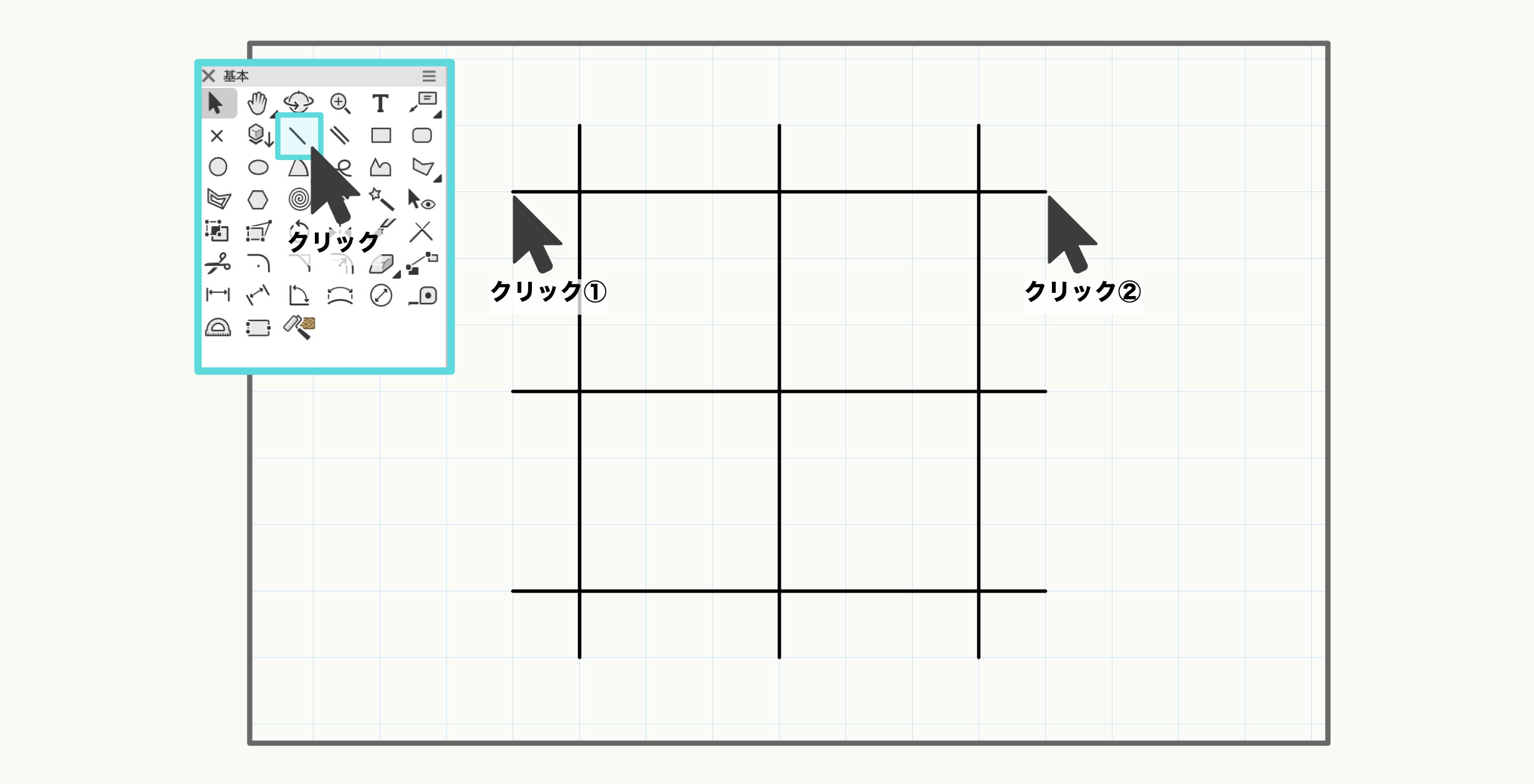 アクティブレイヤを「通り芯」に変更後、「直線」ツールでグリッドに沿ってX方向、Y方向に3000mmのスパンで3本ずつ作図します。