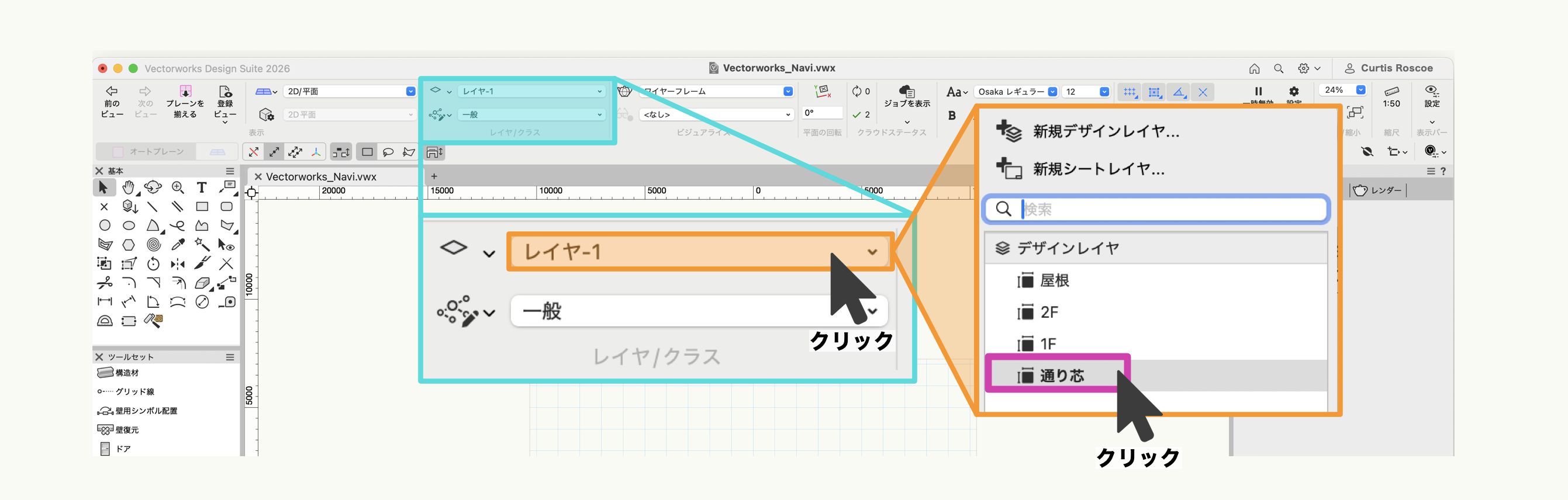 アクティブレイヤは、表示バー内の「レイヤ/クラス」項目、もしくは『ナビゲーション』パレットから簡単に切り替えることができます。