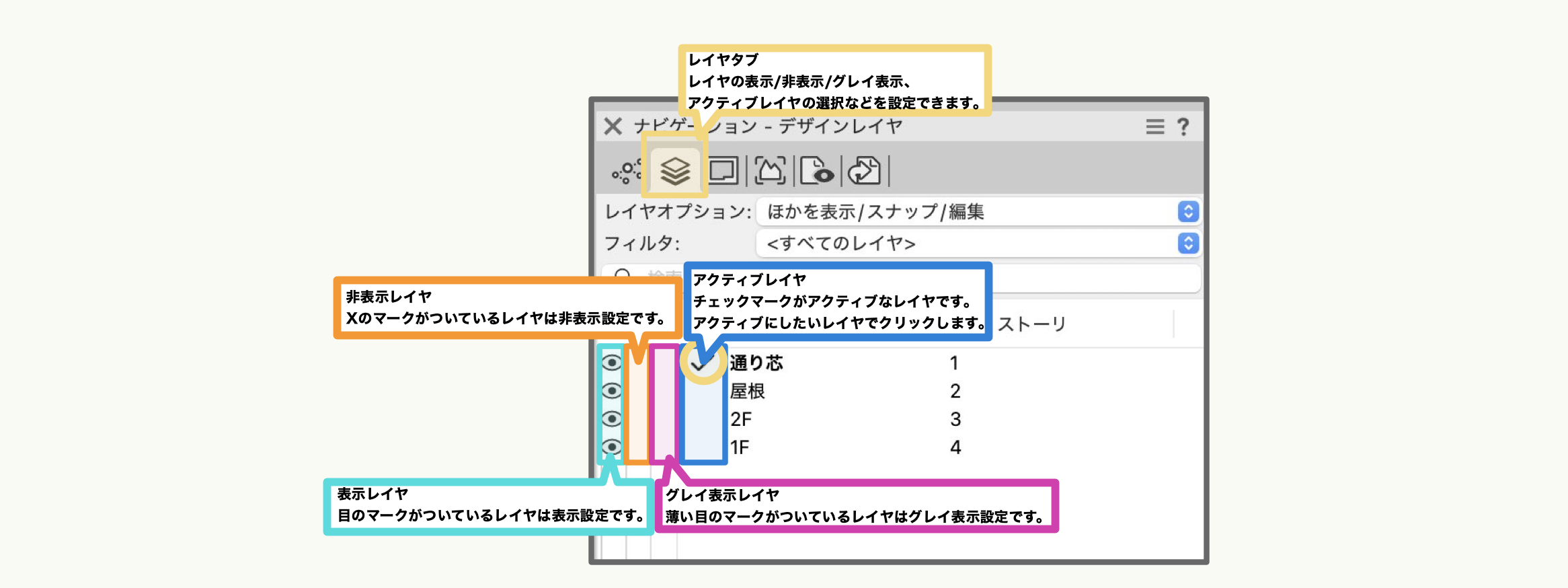 「レイヤ」タブに切り替えるとレイヤの一覧が表示されます。この中で現在選択されているレイヤ(アクティブレイヤ)には名称の横にチェックマークが付いていますので、「通り芯」レイヤの名称の横、チェックマークの列をクリックするとチェックが入り、アクティブレイヤが切り替わります。