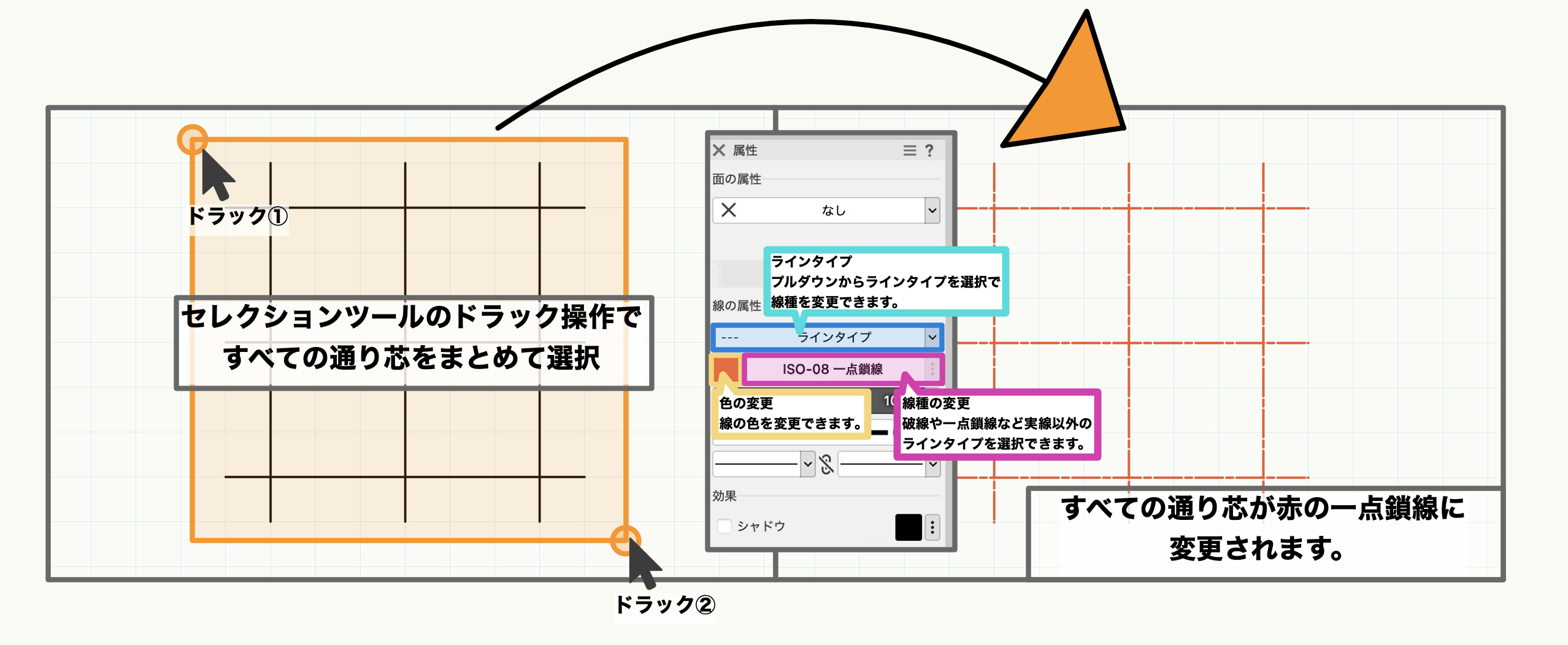 『セレクション』ツールで、作図したすべての線を囲うようにドラック操作し、選択できたら『属性』パレットより線の色を赤色、線種を一点鎖線に変更します。