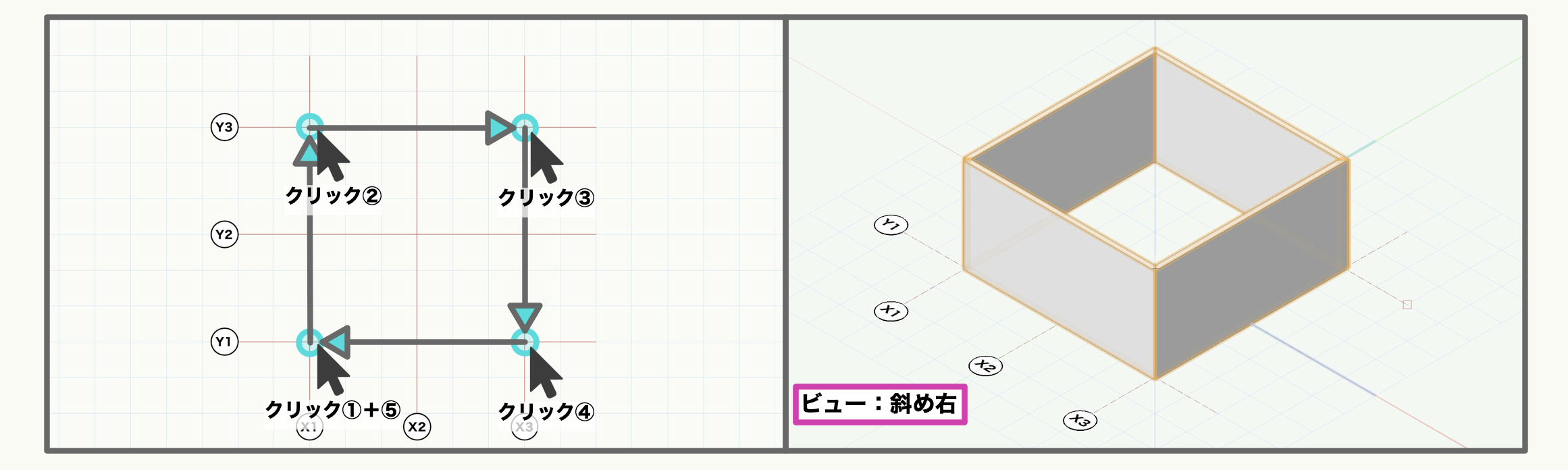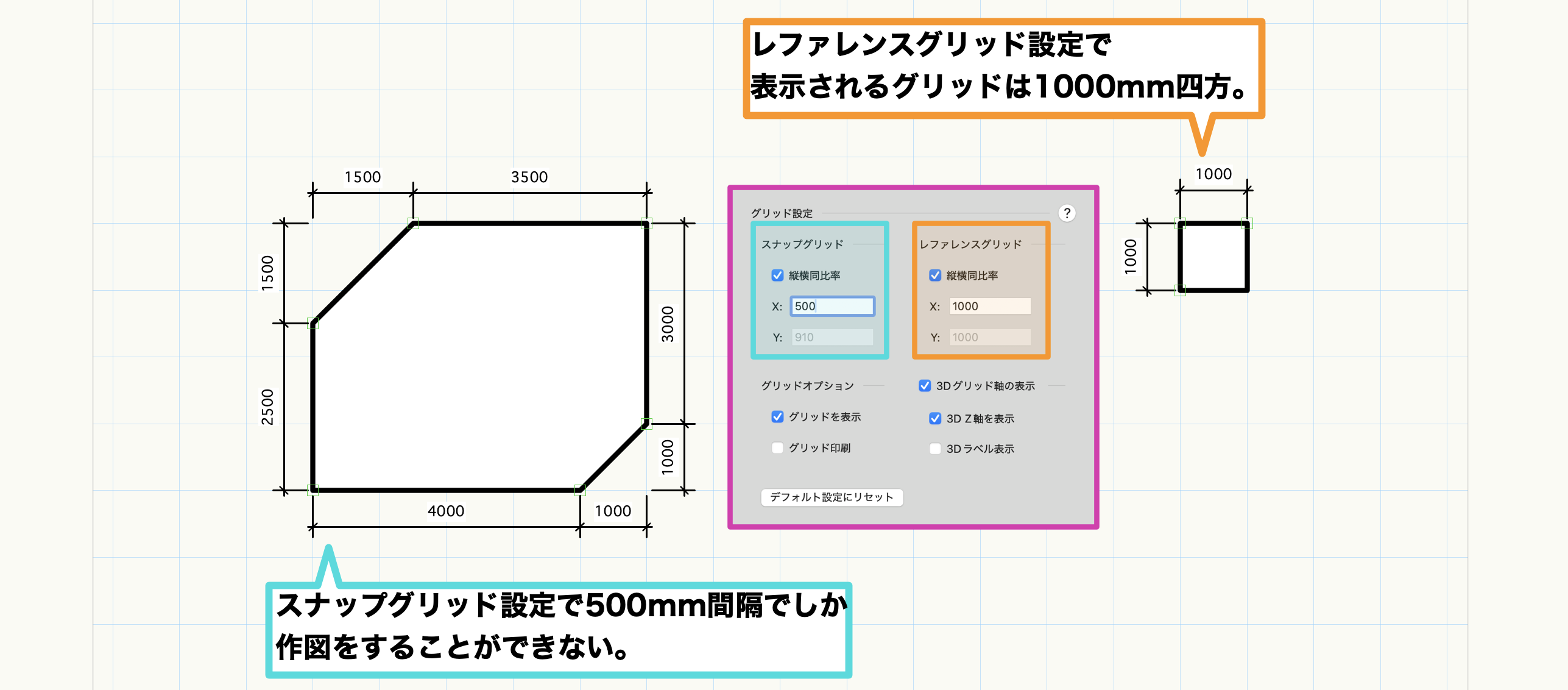 これで画面上に水色の線で1000mm四方のグリッドが表示され、図形を描く際は500mm間隔でしか作図することができない状態になります。