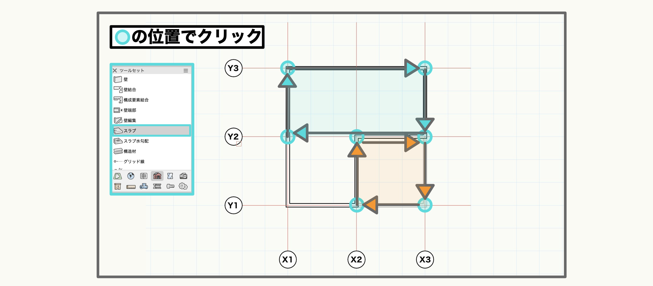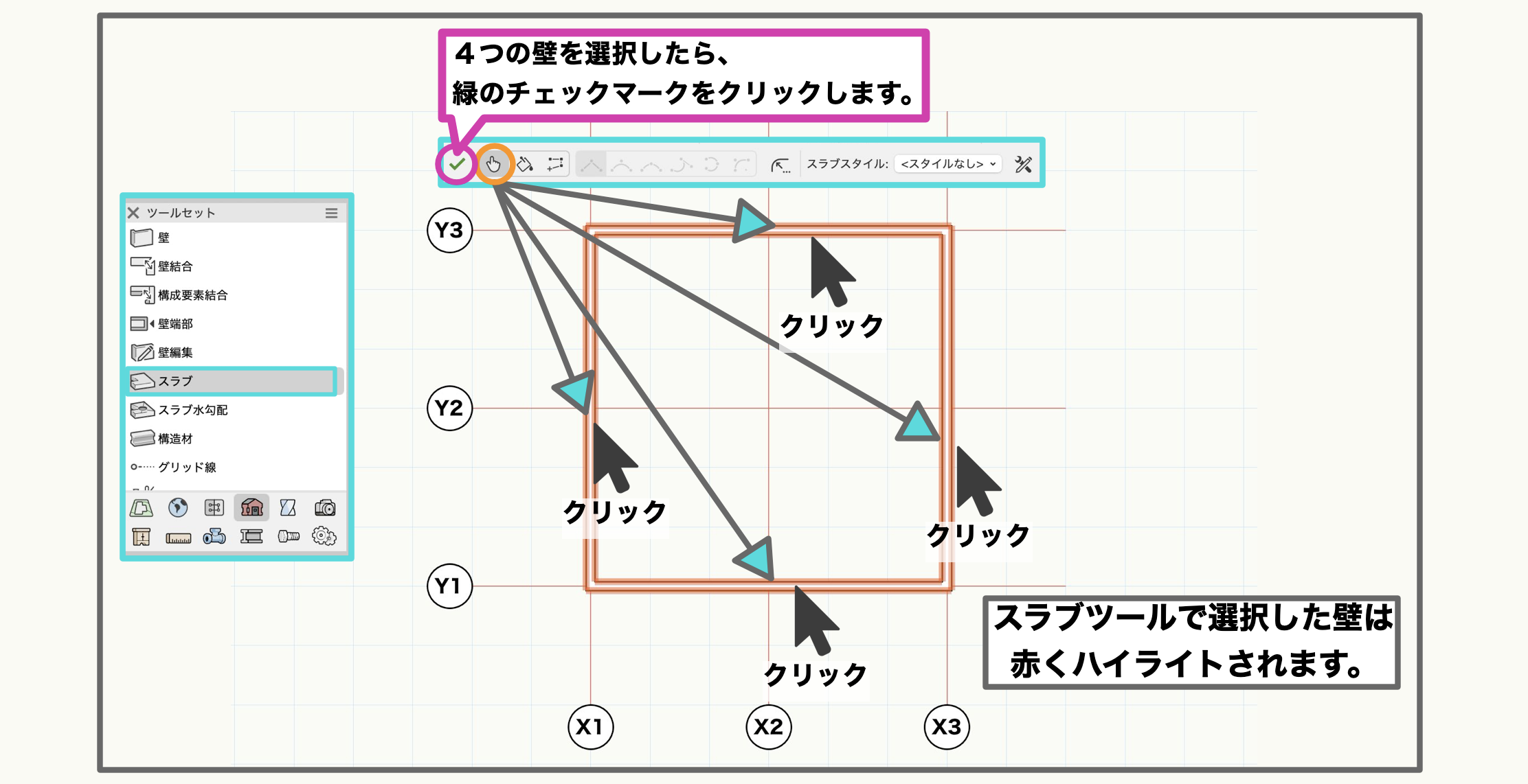 もしも、「500mm間隔に縛られず自由に作図したい」「グリッド線が不要なので表示したくない」場合には再度『グリッドスナップ』アイコンをクリックするとオフにすることができます。