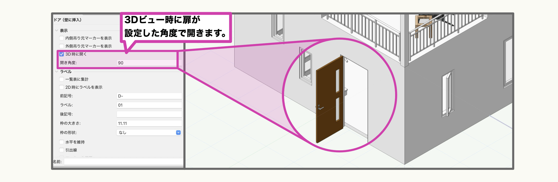 室内展開図ビューポートは、前述の通り壁の幅や高さを自動的に参照しますが、設定によって断面線の調整なども可能です。