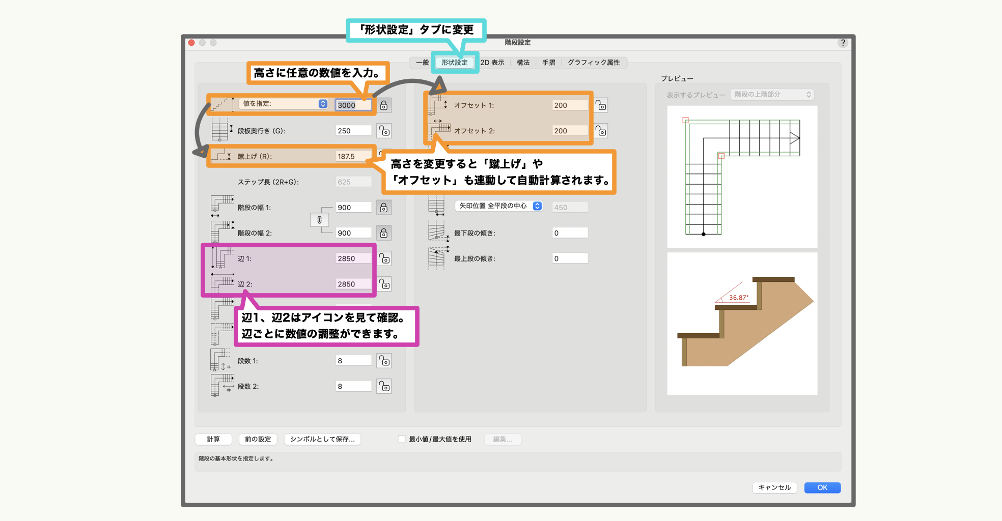 次に「壁の高さ」と「切断面の高さ」を設定します。