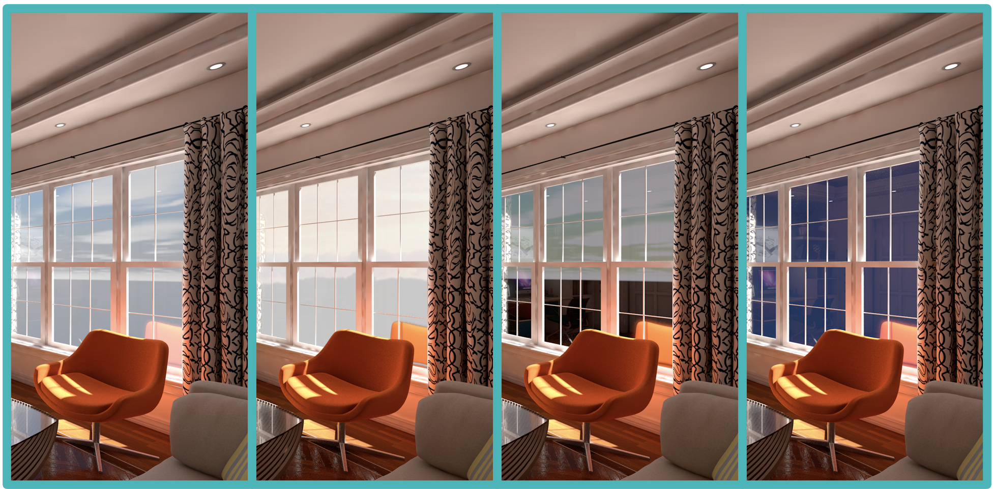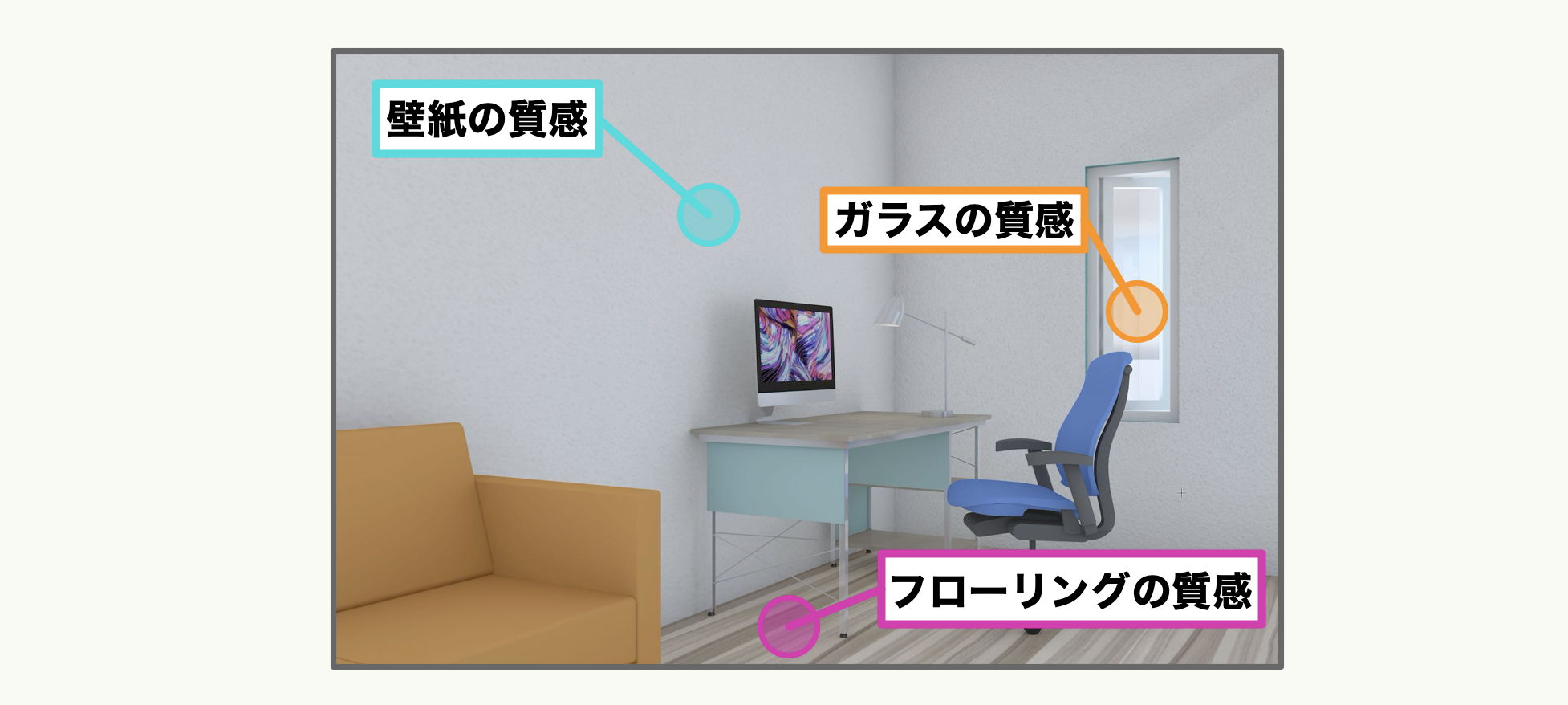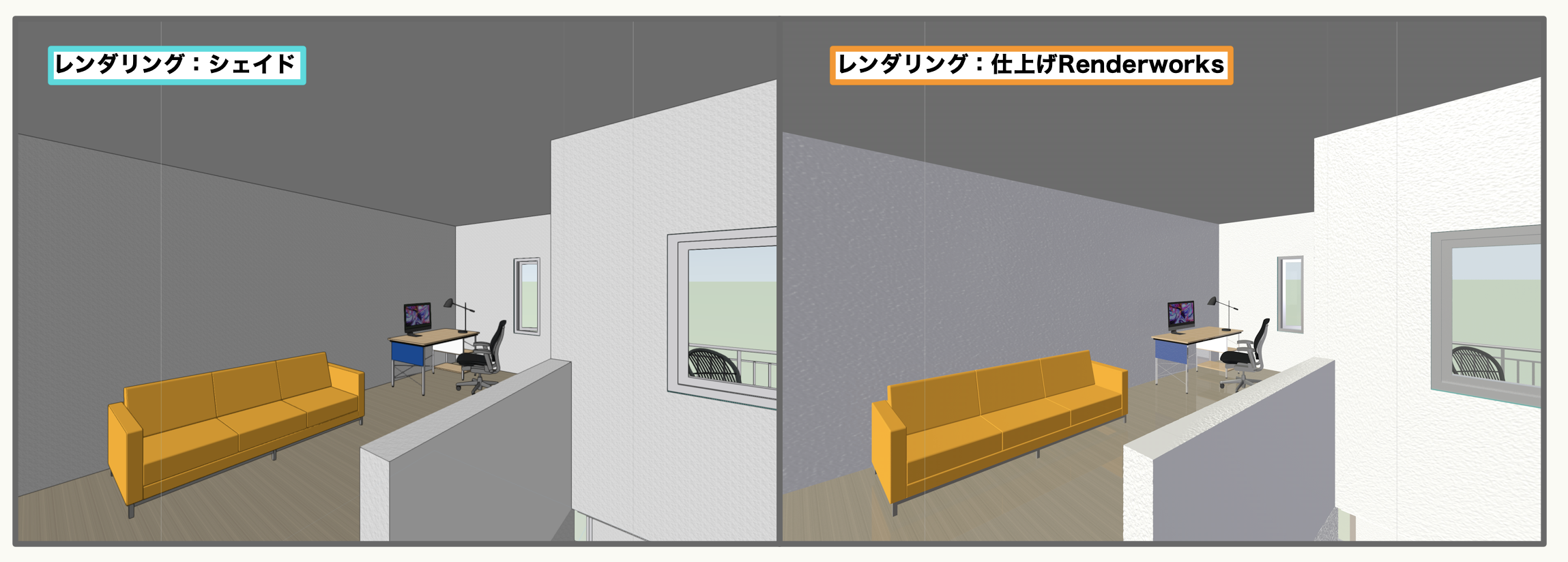 また例えば、屋内パースで背景テクスチャを日中にした場合、部屋の窓からは日差しが入り、屋外風景は昼間の表現となります。