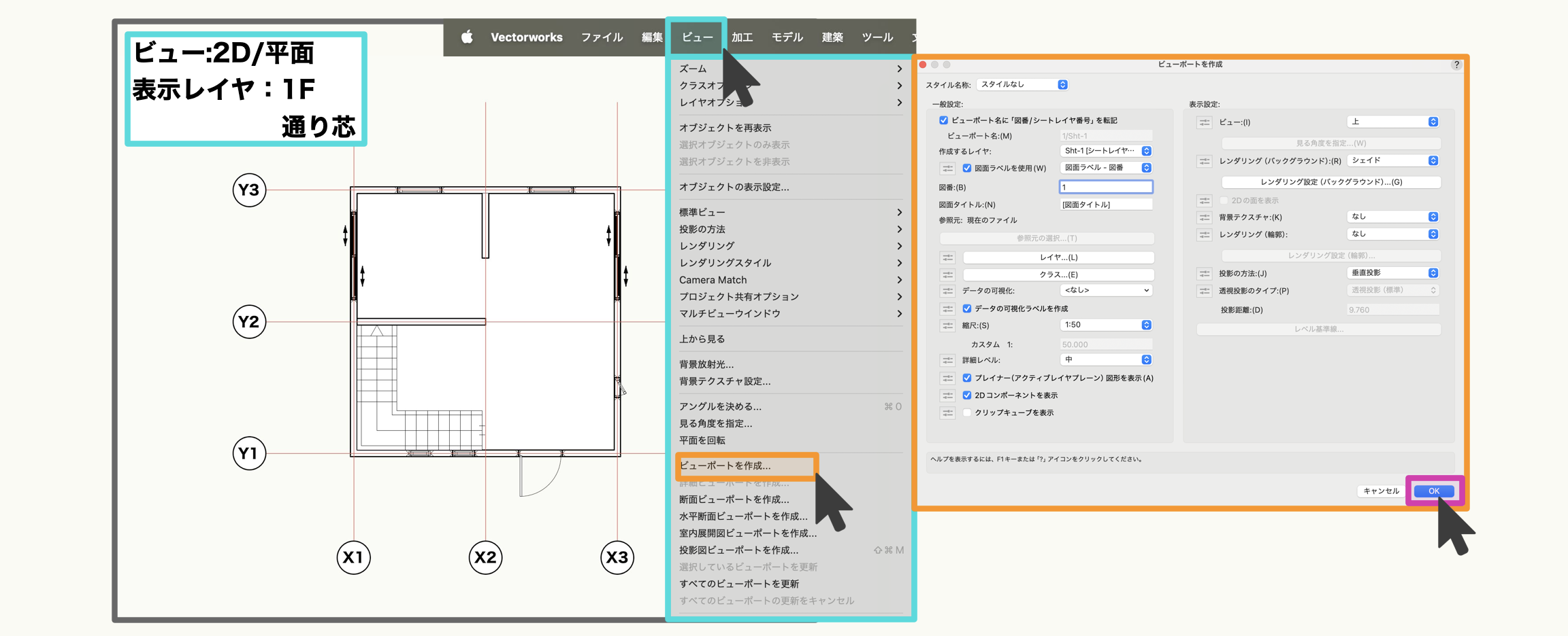 「ビューポートを作成」ダイアログが開くので、そのまま「OK」ボタンをクリックすると、シートレイヤに1F平面図を投影したビューポートが作成されます。