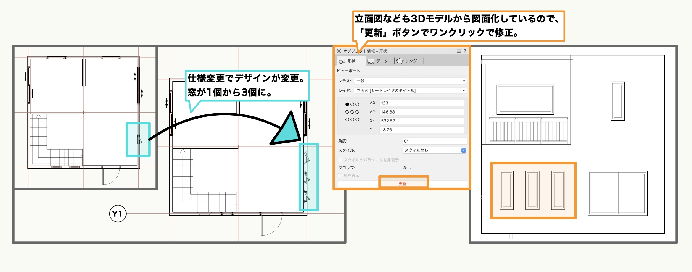 従来の2D CADソフトウェアでは、室内展開図は部屋数が増えれば増えるほど図面枚数が増え、窓やドアなどの仕様変更が発生するたびに影響のある箇所の修正が発生していました。