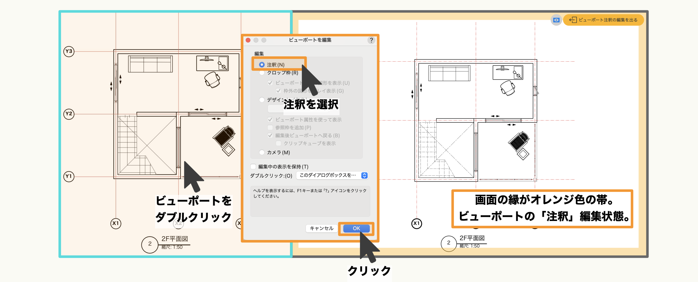 注釈の記入方法は簡単です。注釈を加えたいビューポート図形をダブルクリックすると、」ビューポートを編集」ダイアログが表示されますので、「注釈」にチェックを入れて「OK」ボタンをクリックします。