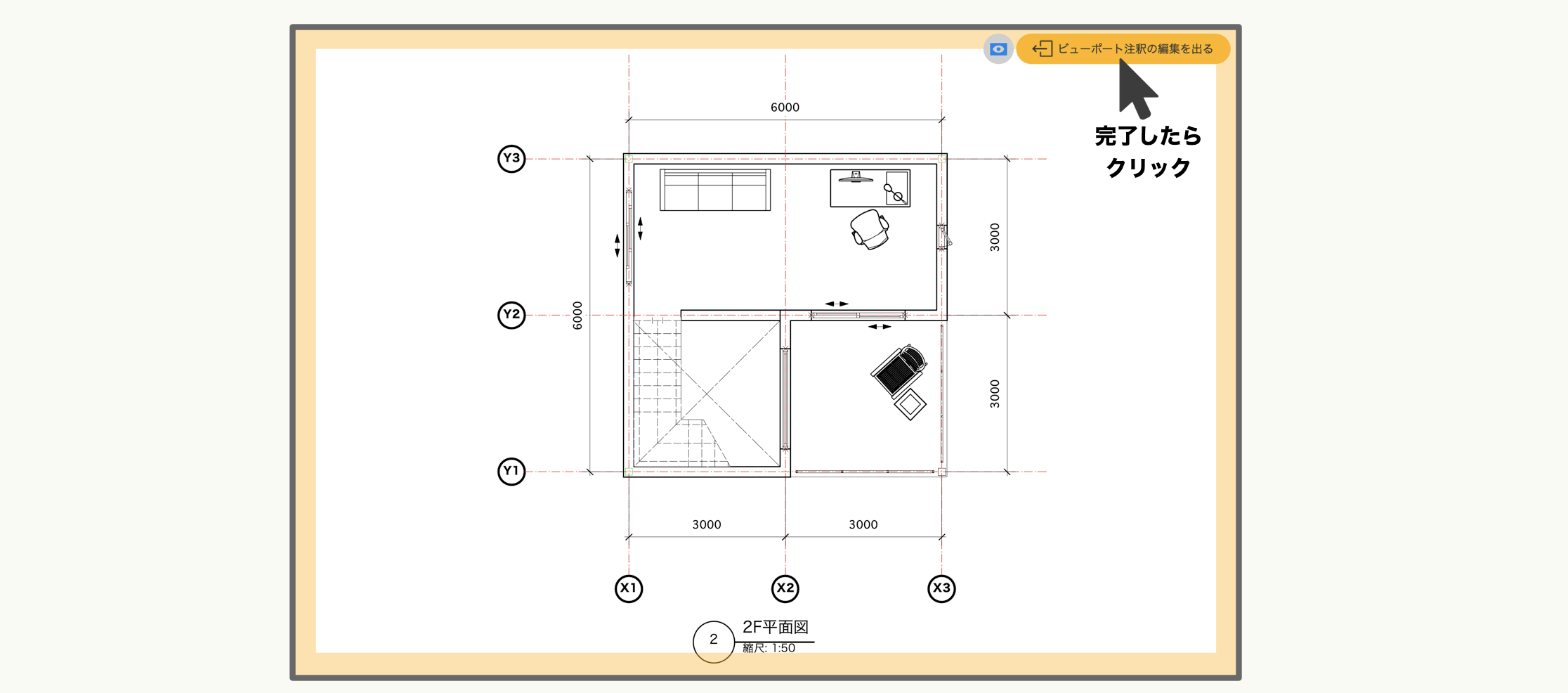 寸法、部屋名などの入力が完了したら、作図領域の右上に表示されている「ビューポート注釈の編集を出る」ボタンを押してください。