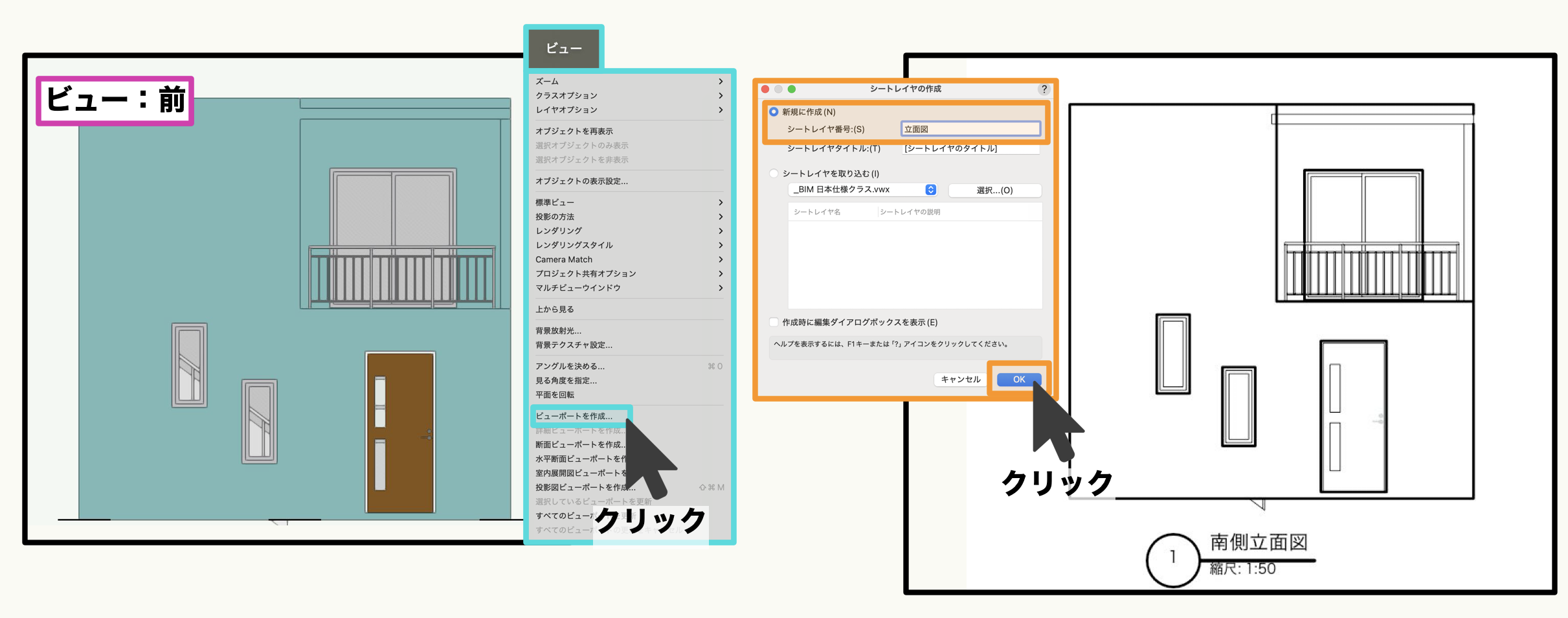 『ビュー』メニュー >『ビューポートを作成』コマンドを実行したら、ビューポート作成ダイアログの「作成するレイヤ」で「新規シートレイヤ」を選択し、任意の名称の新しいシートレイヤを作成して、ここに立面図をまとめてみてください。