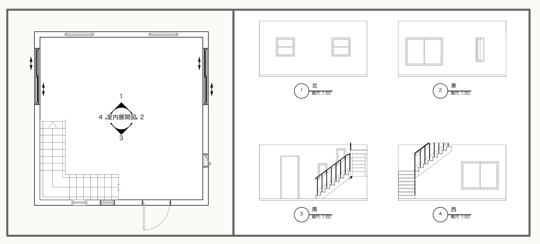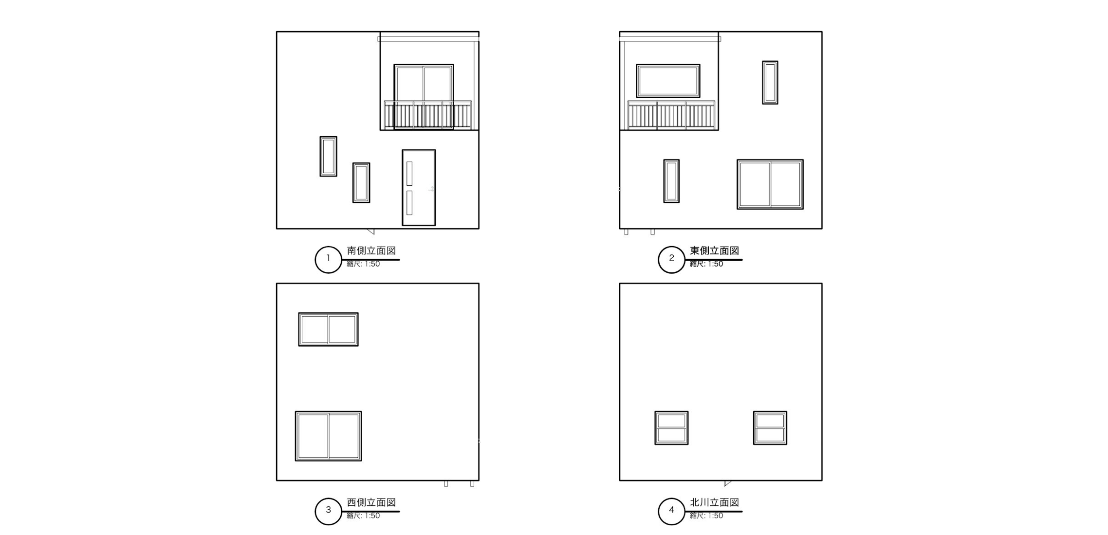 南側の立面図ができたら、その他の方位の立面図も作ってみてください。右、左、後ろの各ビューでビューポートを作り、シートレイヤ上に配置しましょう。