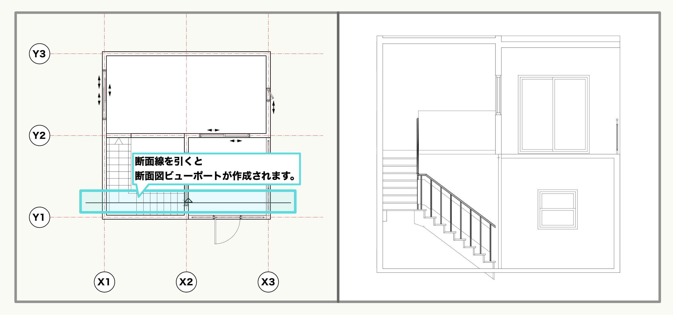 「断面ビューポート」は、2D平面図に断面指示線を作図することで、そのラインに応じた断断面図を自動的に作成する機能です。