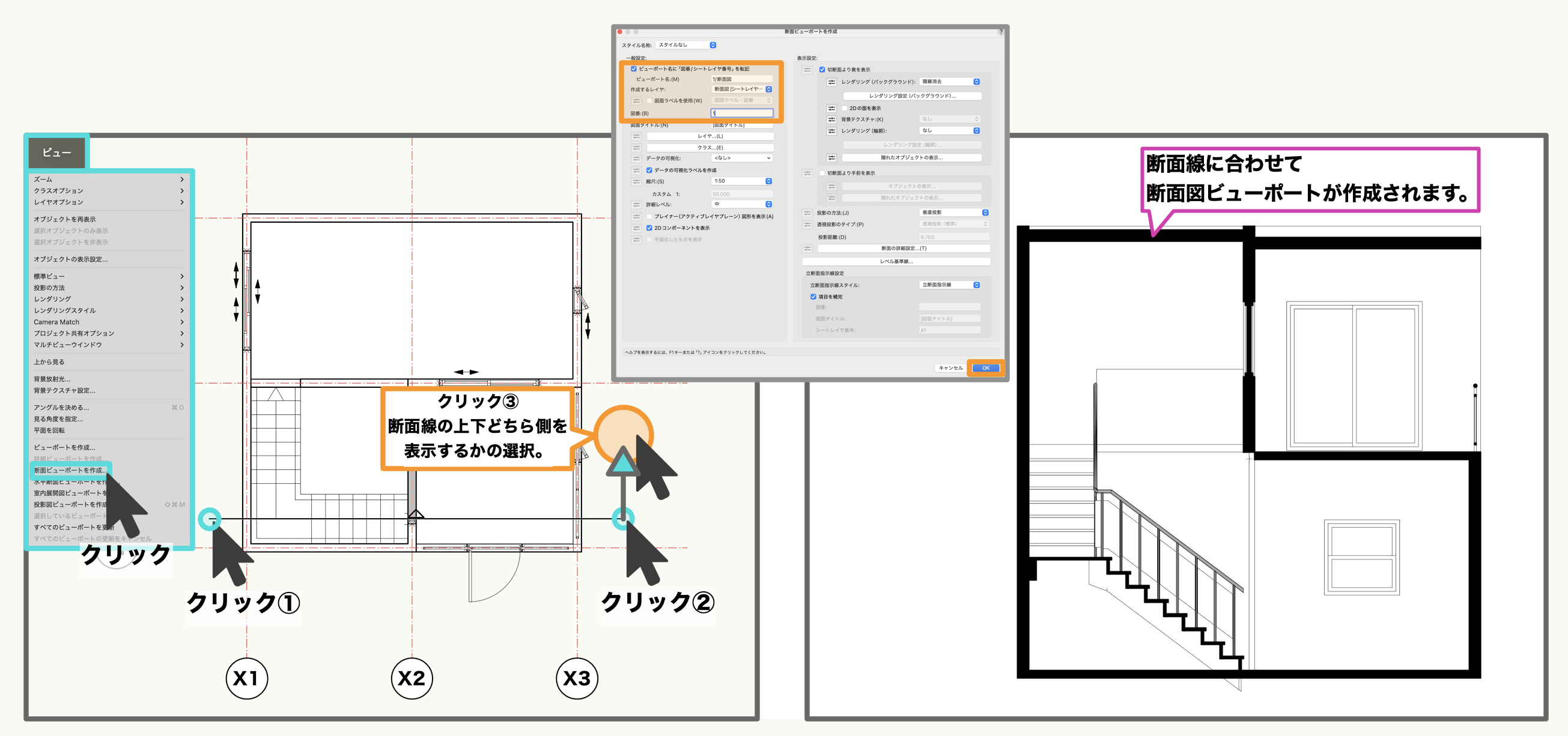 Vectorworks Architect には、断面図作成用の専用機能として『断面ビューポートを作成』コマンドが搭載されています。