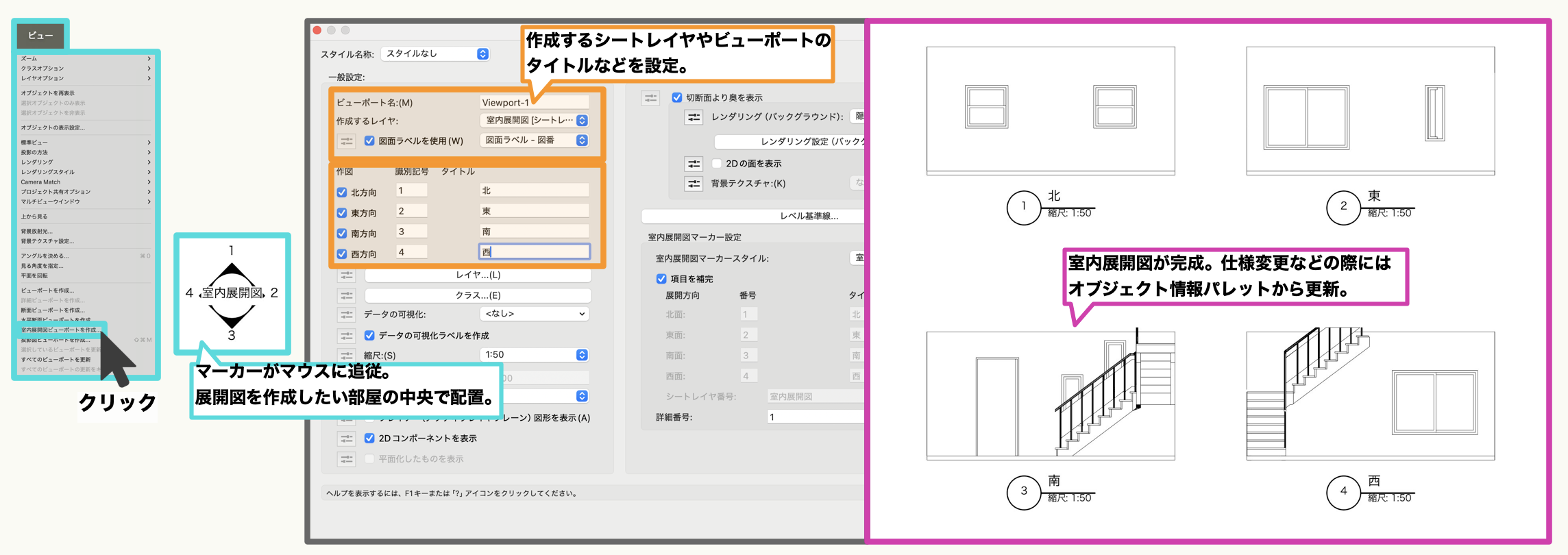 Vectorworks Architect には、室内の展開図作成用の専用機能として『室内展開図ビューポートを作成』コマンドが搭載されています。