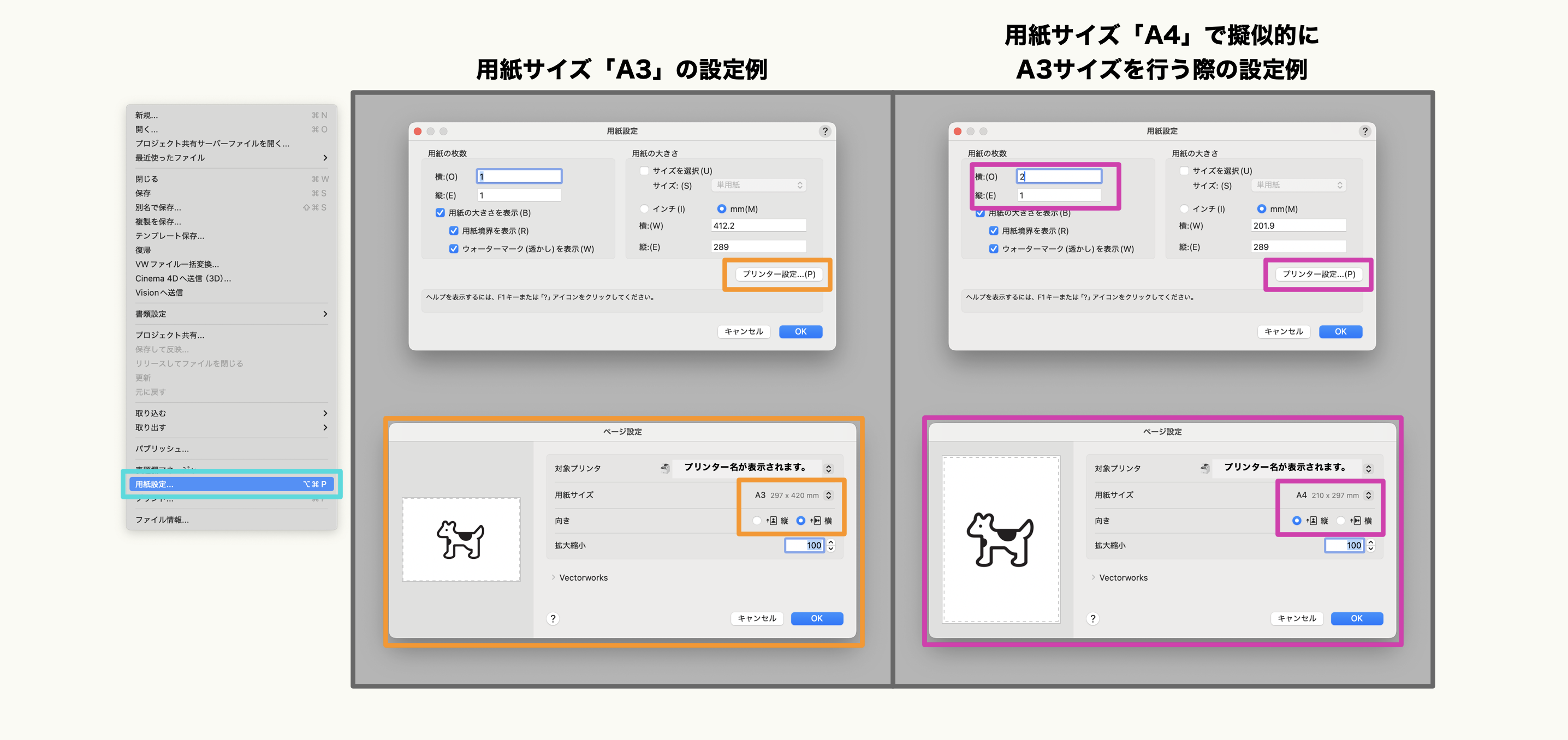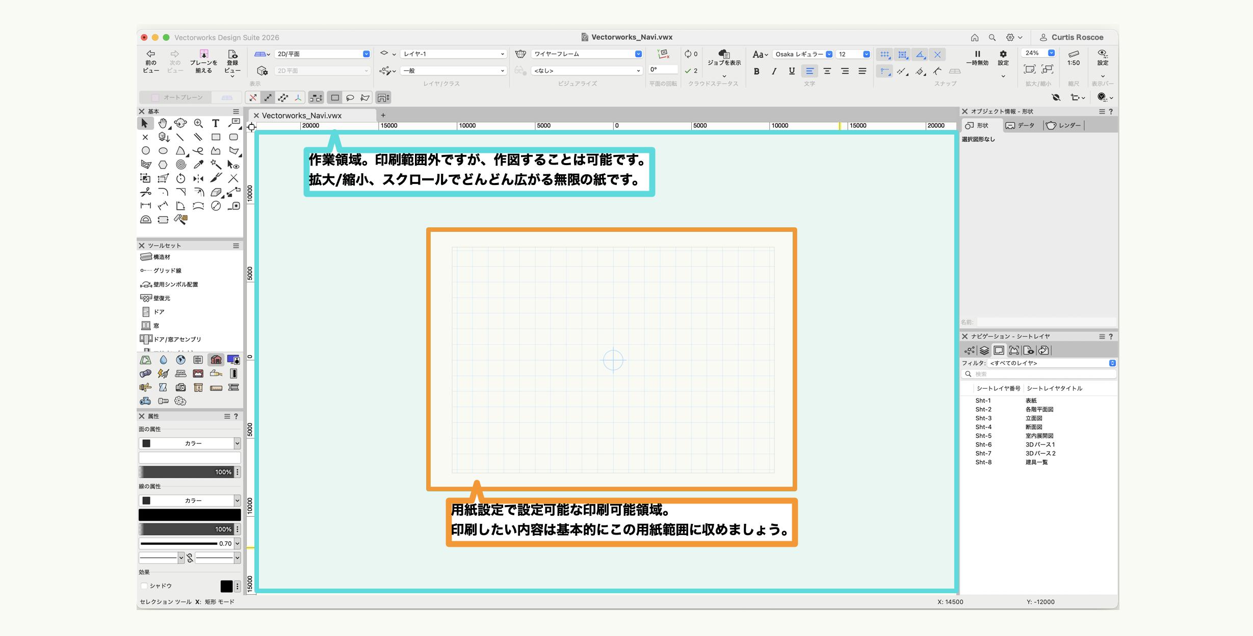 Vectorworks の「用紙設定」とは、印刷範囲を設定するという意味合いになります。