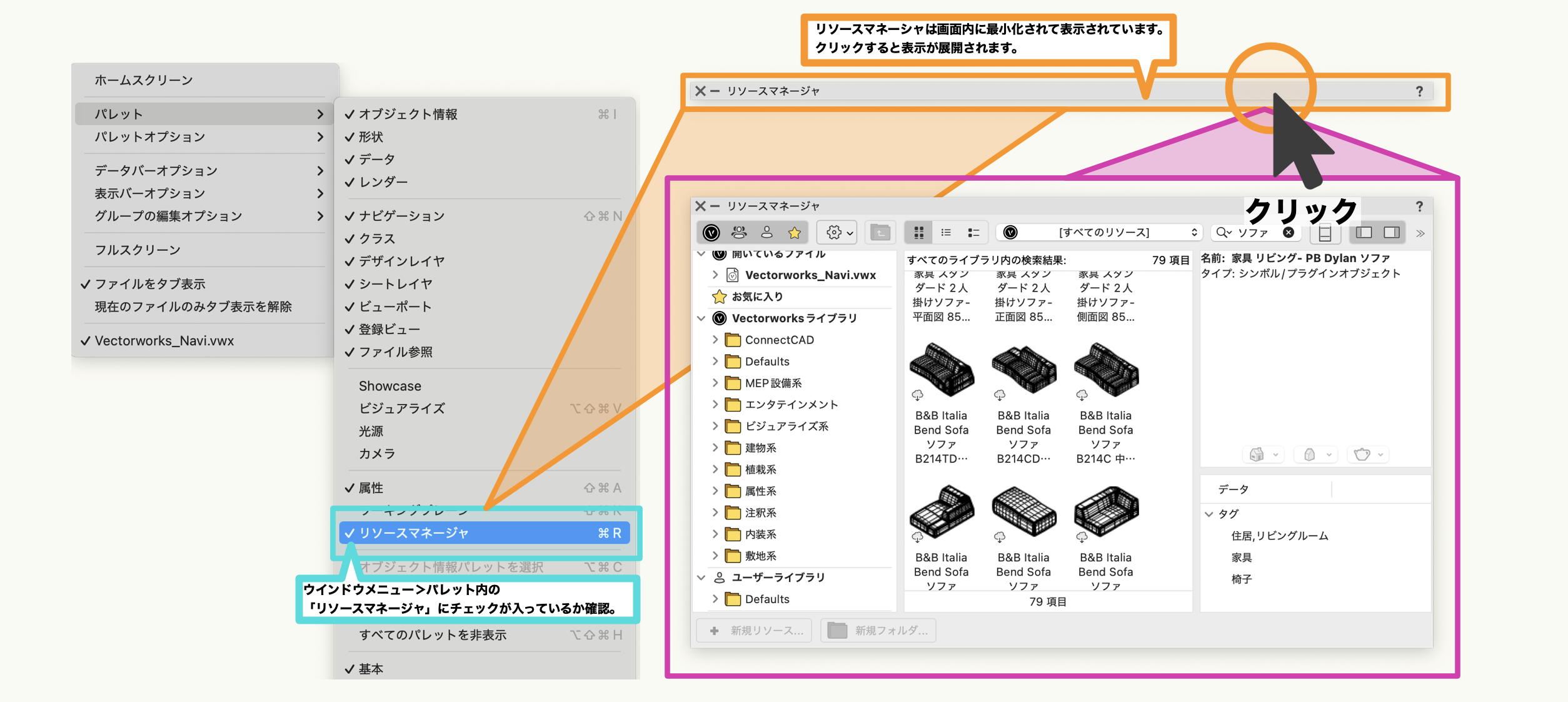 建築、レンダリング、ワークシートなど、ご質問の多い内容をまとめて紹介しているコンテンツ『Vectorworks Navi』をご利用ください。
