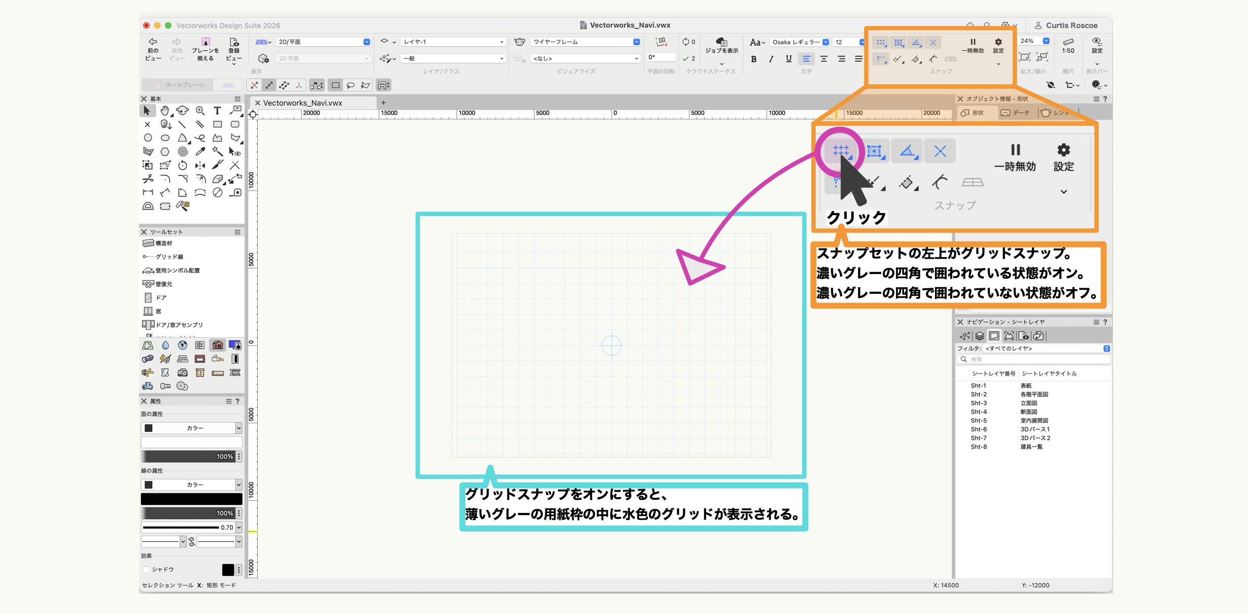 最後に、『グリッドスナップ』アイコンをクリックして、スナップ機能をオンにして完了です。