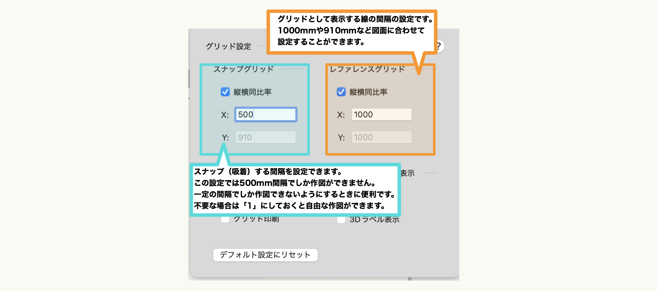 リファレンスグリッドと同値にするという考え方もありますが、今回はもう少し間隔を小さくしたいのでスナップグリッドのXの値には「500」と入力します。