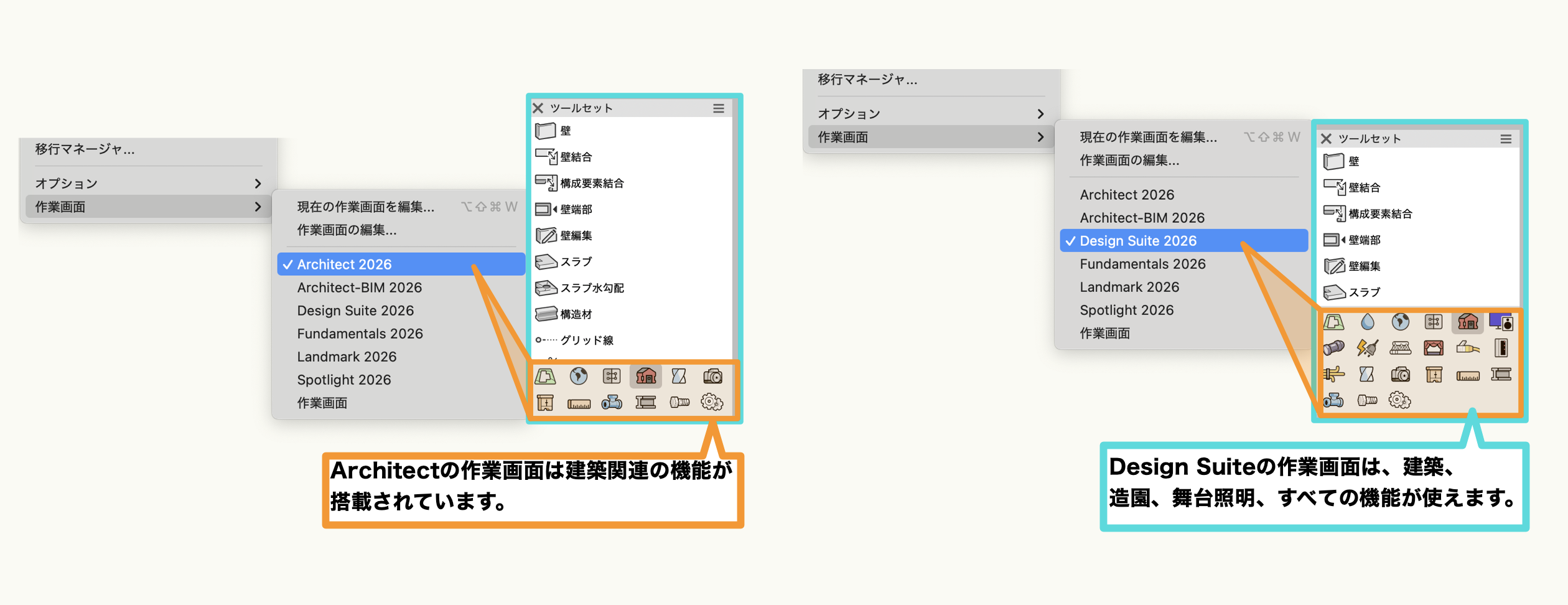 Vectorworks では、それぞれの製品によって各分野別の機能を管理するために『作業画面』という機能があります。