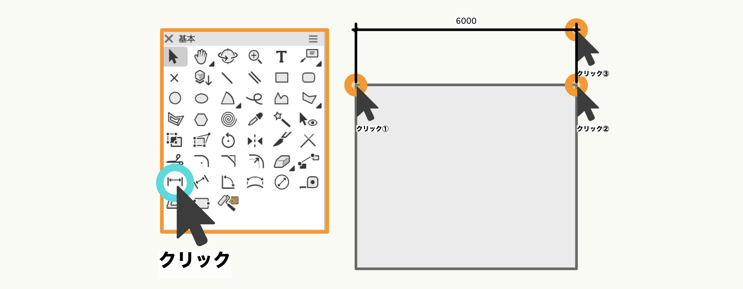 『縦横寸法』ツールを選択したら、寸法を記入する始点位置で1回目のクリック、続けて終点となる位置で2回目のクリックをします。最後に寸法値を表示したい位置まで引き延ばして3回目のクリックをすると、寸法線が入力されます。