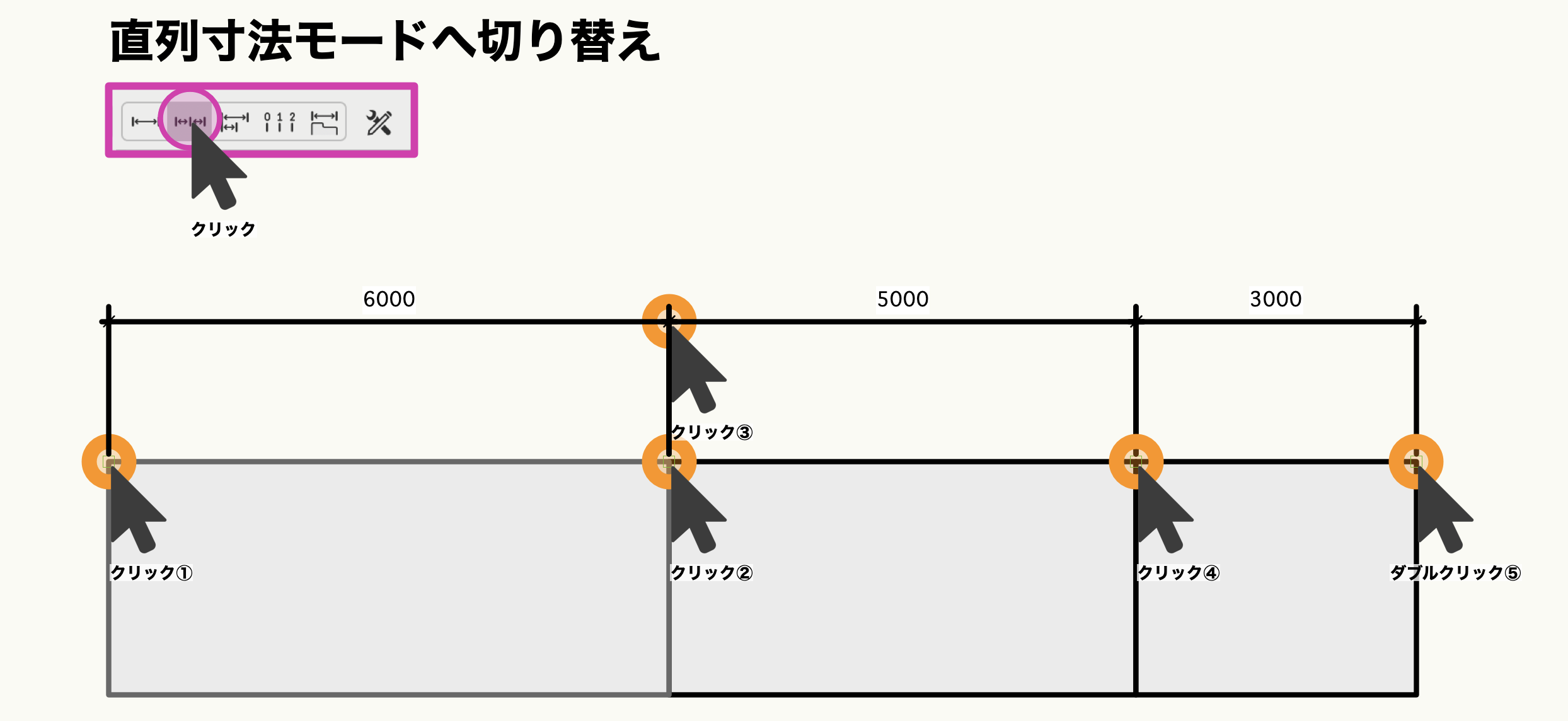 また、連続した寸法を記入したい場合は、『縦横寸法』ツールの「直列寸法」モードを使いましょう。