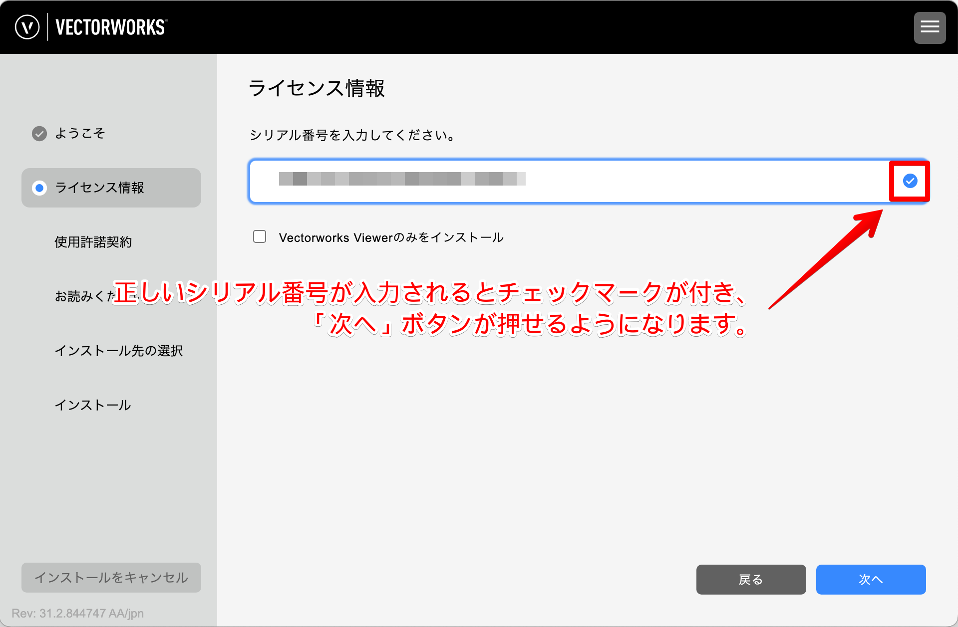 シリアル番号にアルファベットのO(オー)とI(アイ)は使用していません。0はゼロを、1はイチを意味します。 - シリアル入力欄は、正しく入力されると緑色チェックマークが付き、「次へ」ボタンが押せるようになります。「次へ」ボタンが押せない場合は、入力内容に不備があり、赤色の!マークが付きます。正しい情報を入力してください。