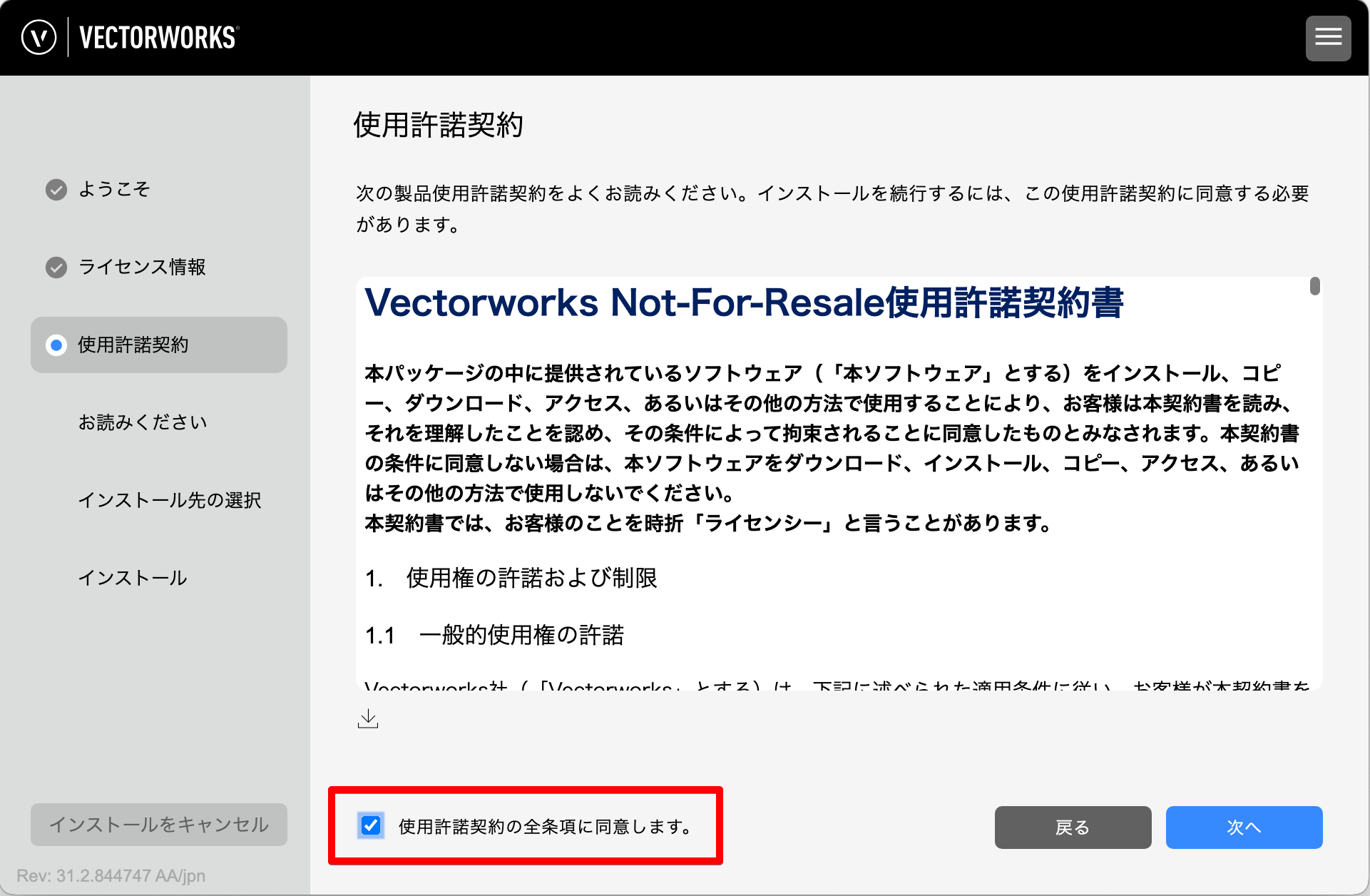 使用許諾契約をよくお読みいただき、ご同意いただける場合は「同意します」をチェックして、「次へ」ボタンをクリックしてください。