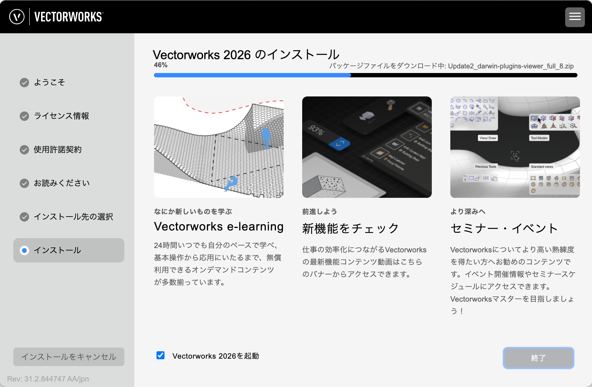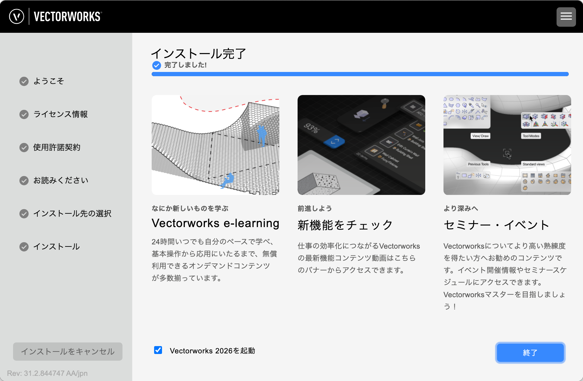 すぐにVectorworksを使用する場合は、「Vectorworks 2026 を起動」にチェックを入れてください。