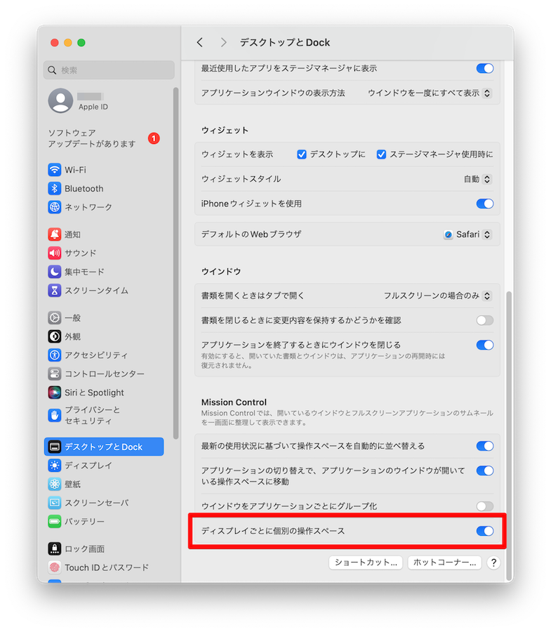 ここにある『ディスプレイごとに個別の操作スペース』オプションを有効にしてください。