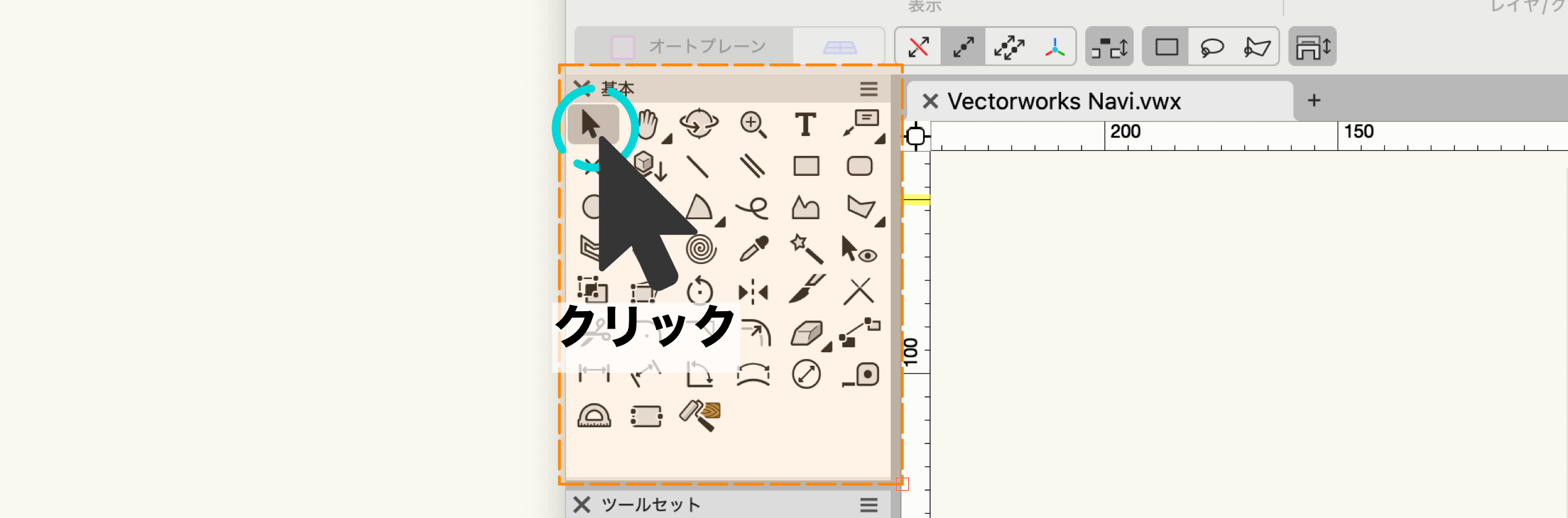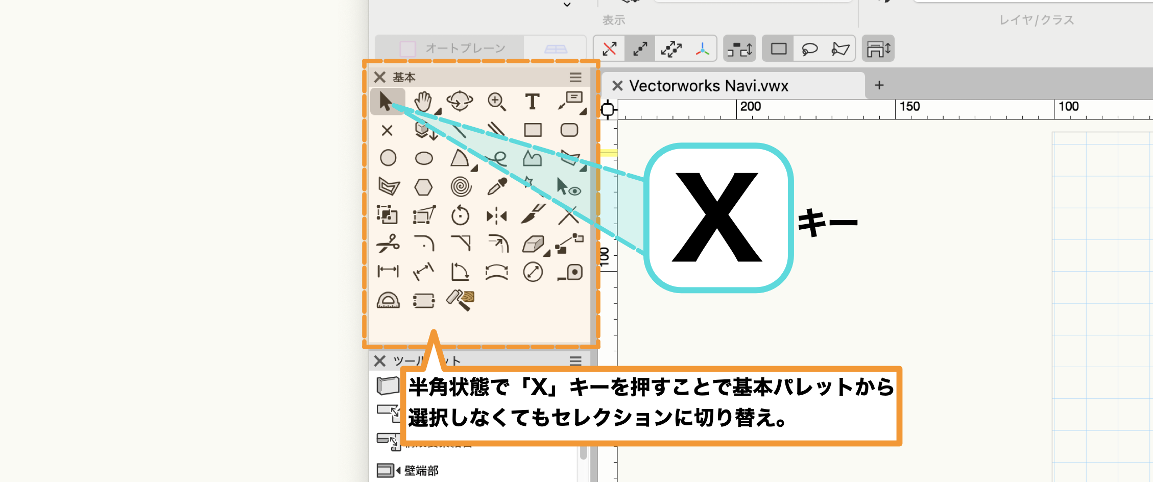 Vectorworks の作図に必要なツールは、『基本』パレットと『ツールセット』パレットにまとまっています。