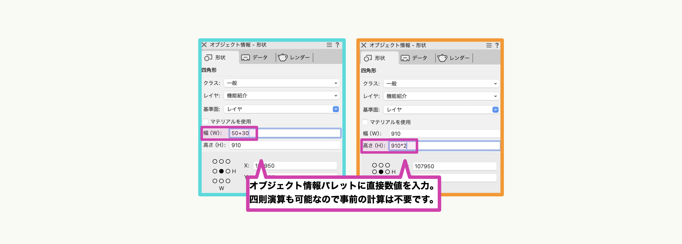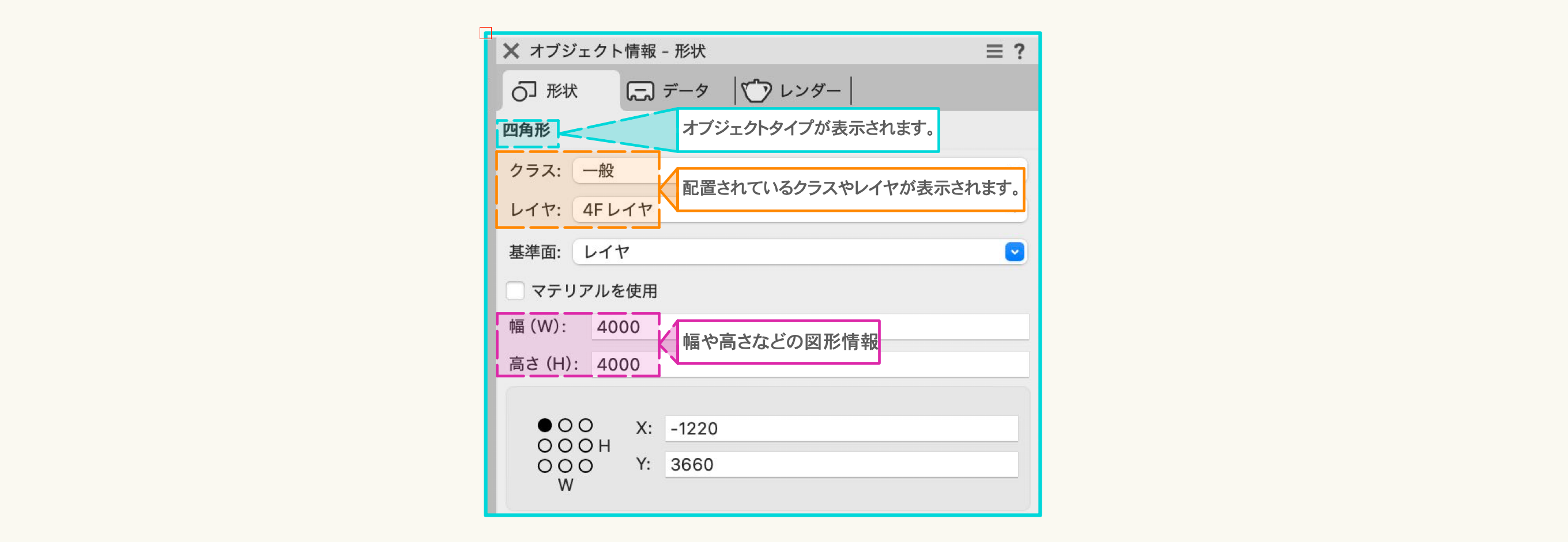 選択した図形は、画面右側にある『オブジェクト情報』パレットに情報が表示されます。