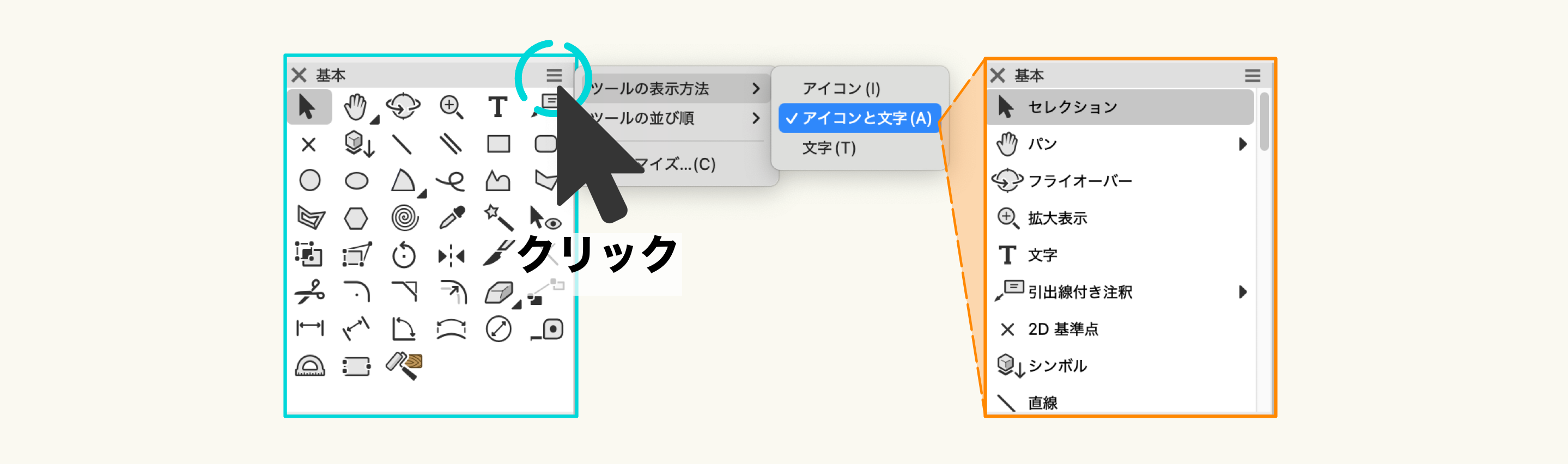 ここをクリックし、ツールの表示方法をクリックして「アイコンと文字」を選択すると、基本パレットの中身がアイコンとツール名で表示されるようになります。お好みに応じた方法でご利用ください。