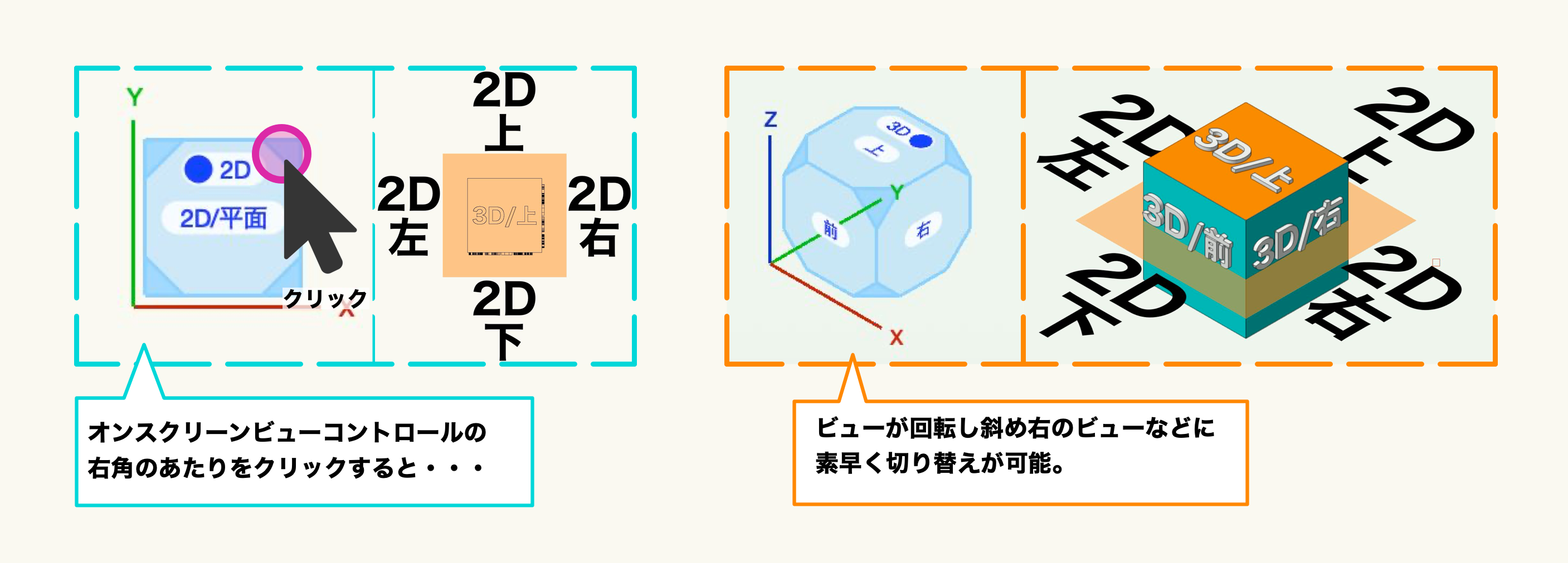 『オンスクリーンビューコントロール』は、作図領域の左下に表示されています。クリックして直感的に操作を行なってみましょう。