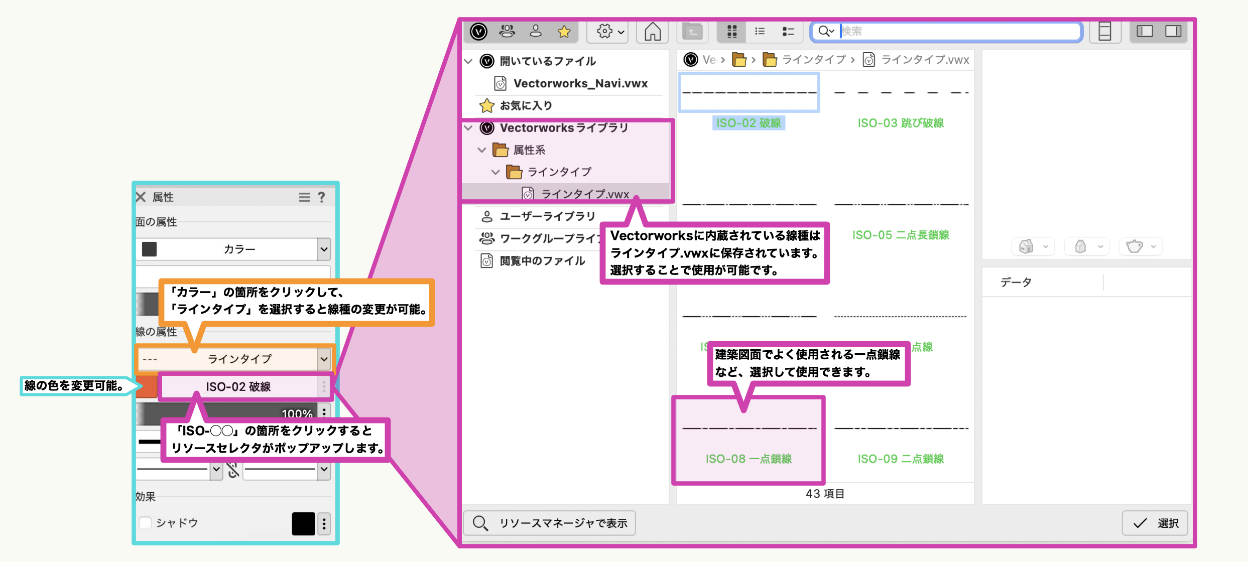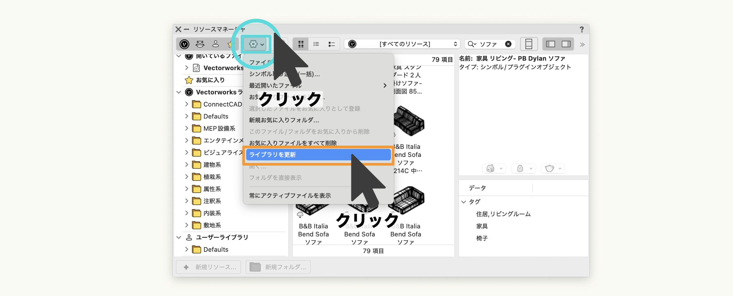 Vectorworks には、「リソース」と呼ばれる素材データが豊富に用意されています。