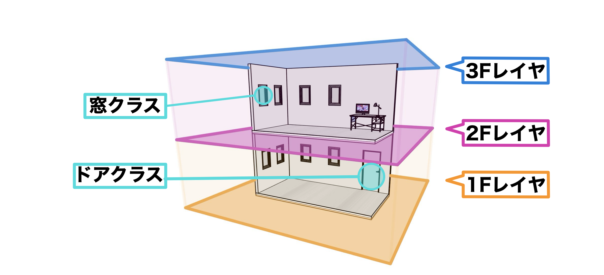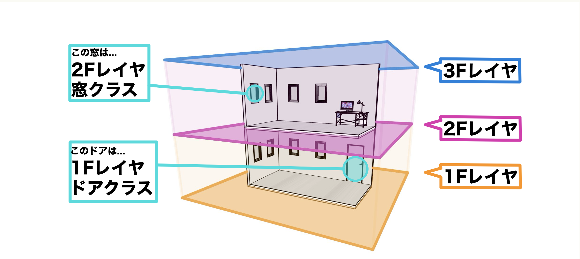 一般的な使用用途として、建築分野ではレイヤは1Fや2F、床/壁/天井のような階層的な分け方で使われることが多いです。